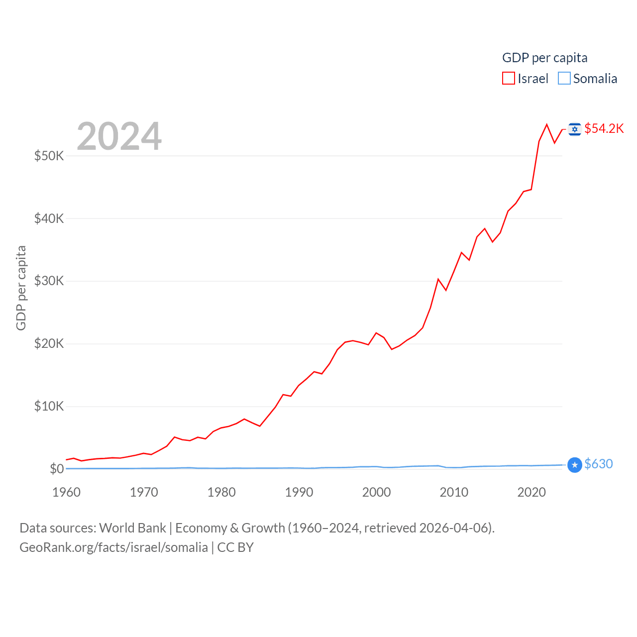 By GDP, Israel ranks 29/197 ($540B) and Somalia ranks 150/197 ($12B). By GDP per capita, Israel ranks 21/197 ($54,177), while Somalia ranks 192/197 ($630).