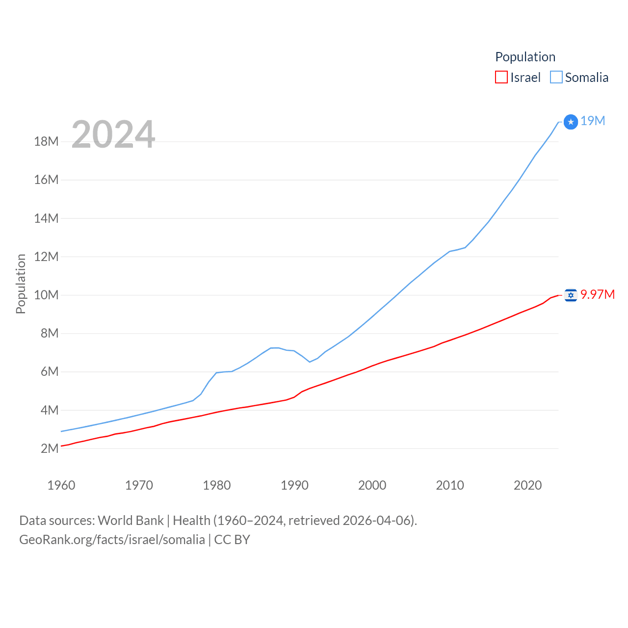 Israel has a population of 9.97M (ranked 96/197), compared with 19M in Somalia (ranked 68/197). Israel's land area is 8,355 sq mi versus 242,217 sq mi for Somalia (ranked 149th vs. 42nd).