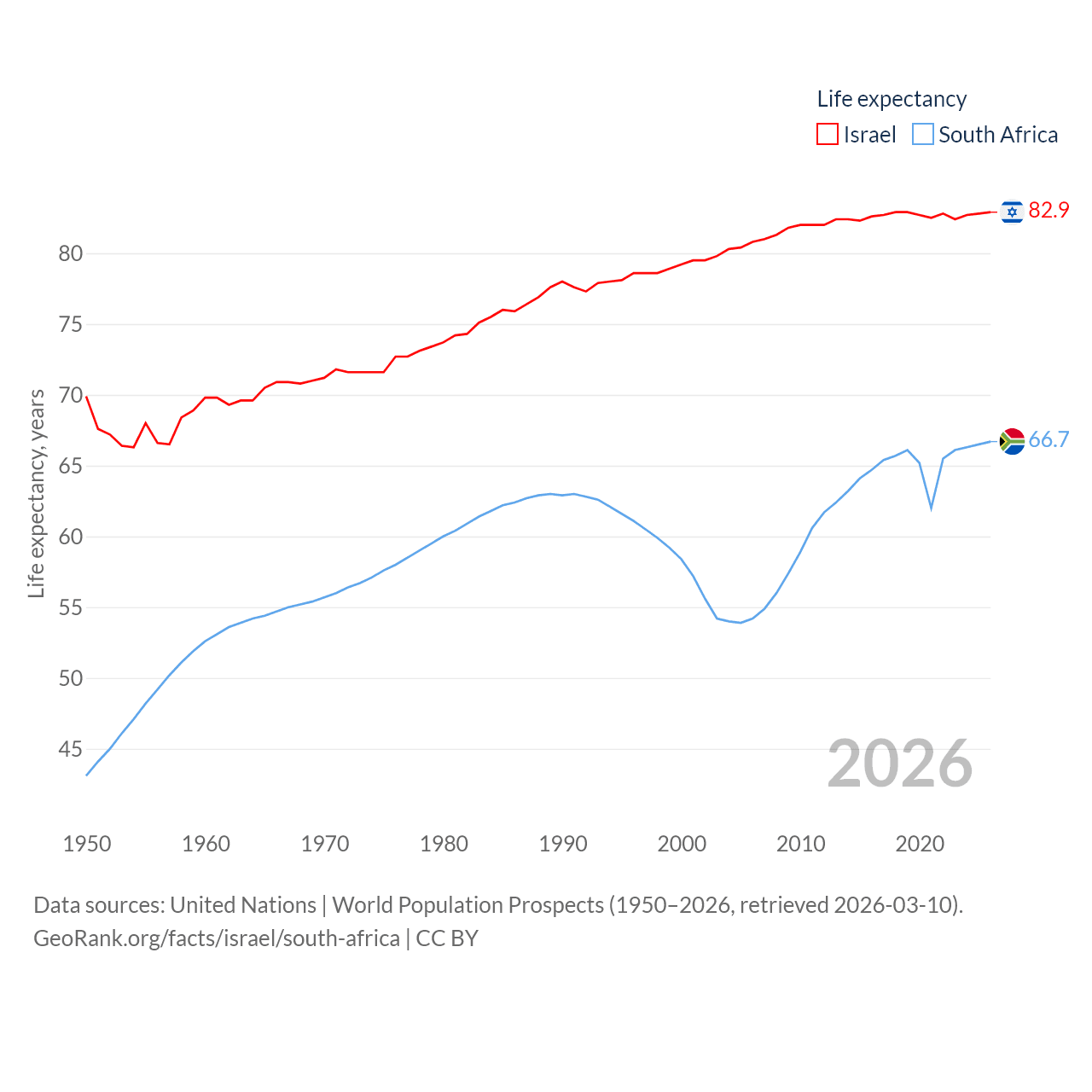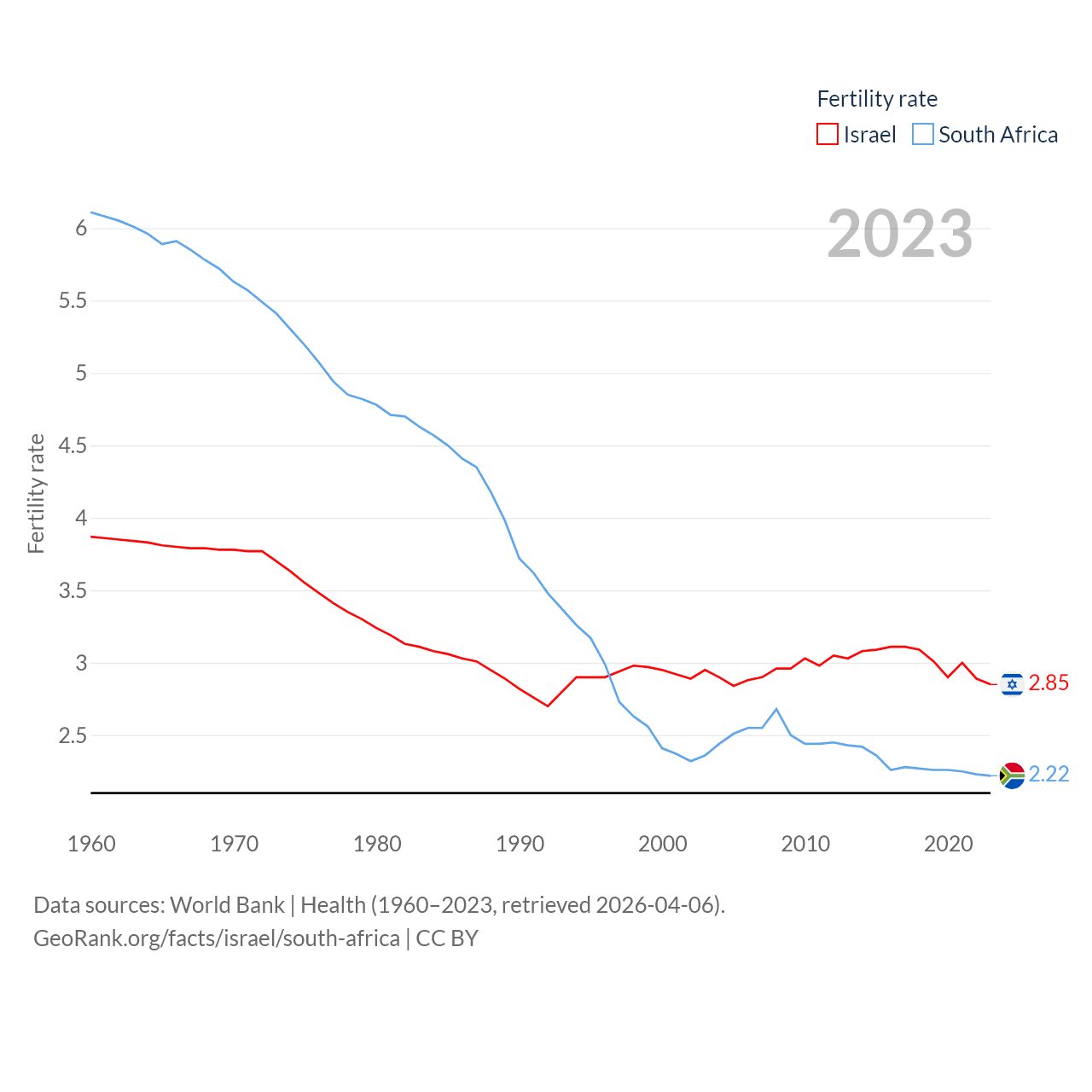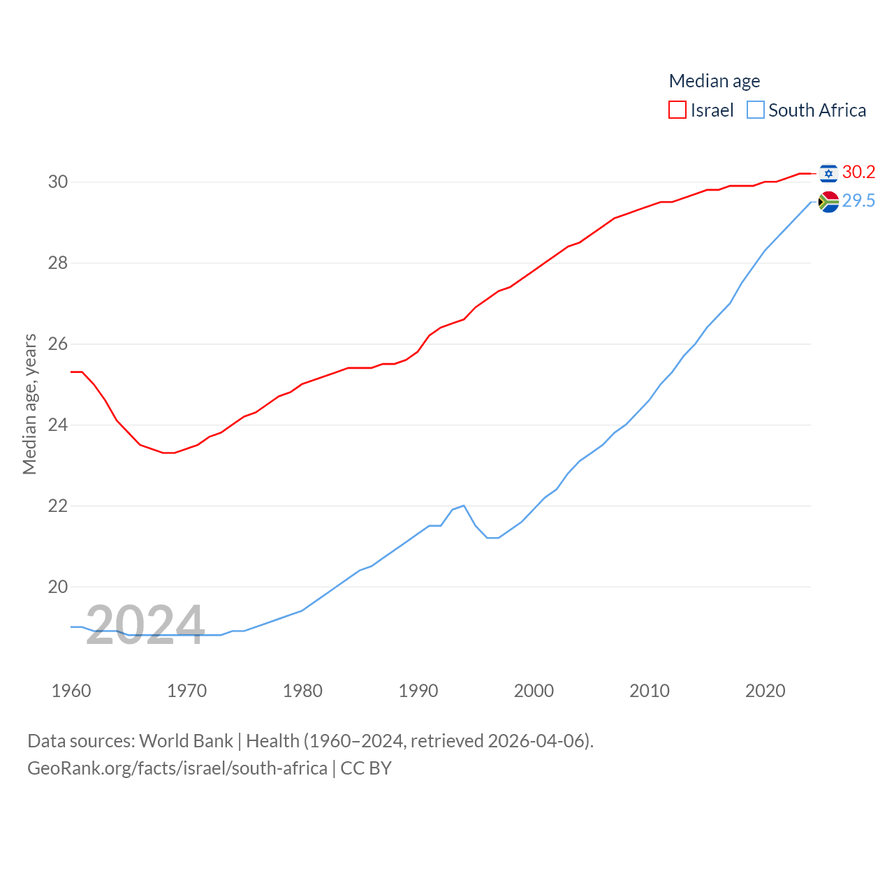 Israel has a population of 9.97M (ranked 96/197), compared with 64M in South Africa (ranked 24/197). Israel's land area is 8,355 sq mi versus 468,377 sq mi for South Africa (ranked 149th vs. 24th).