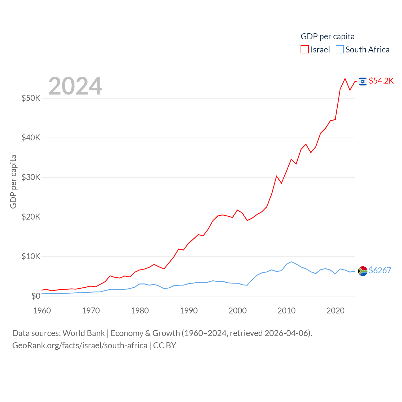 By GDP, Israel ranks 29/197 ($540B) and South Africa ranks 40/197 ($401B). By GDP per capita, Israel ranks 21/197 ($54,177), while South Africa ranks 111/197 ($6,267).