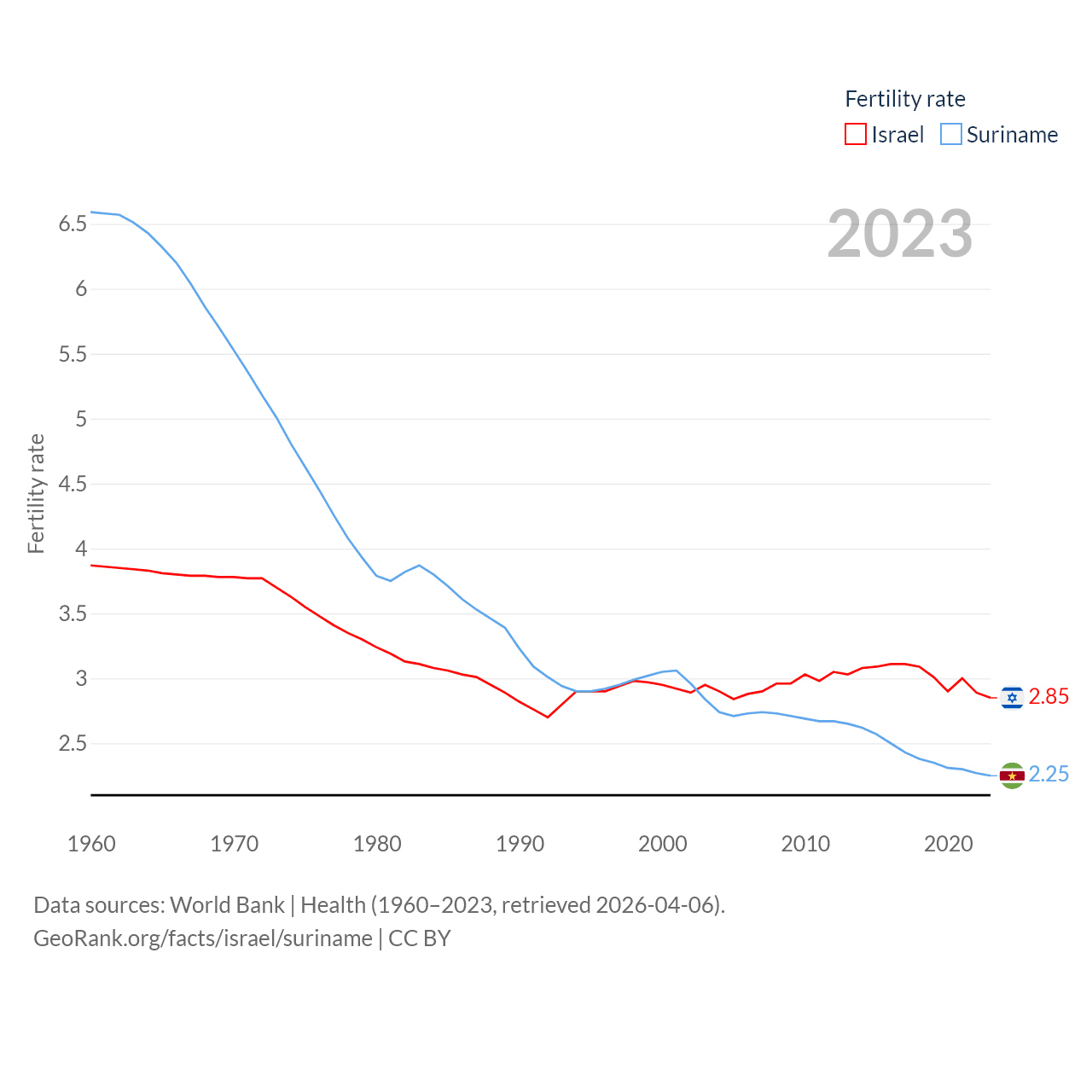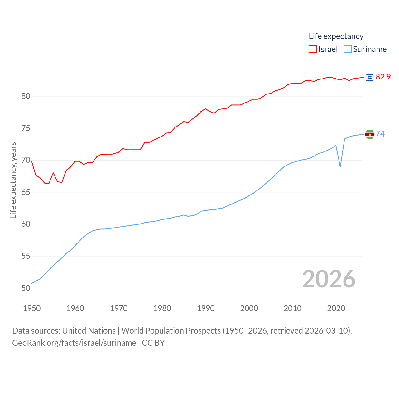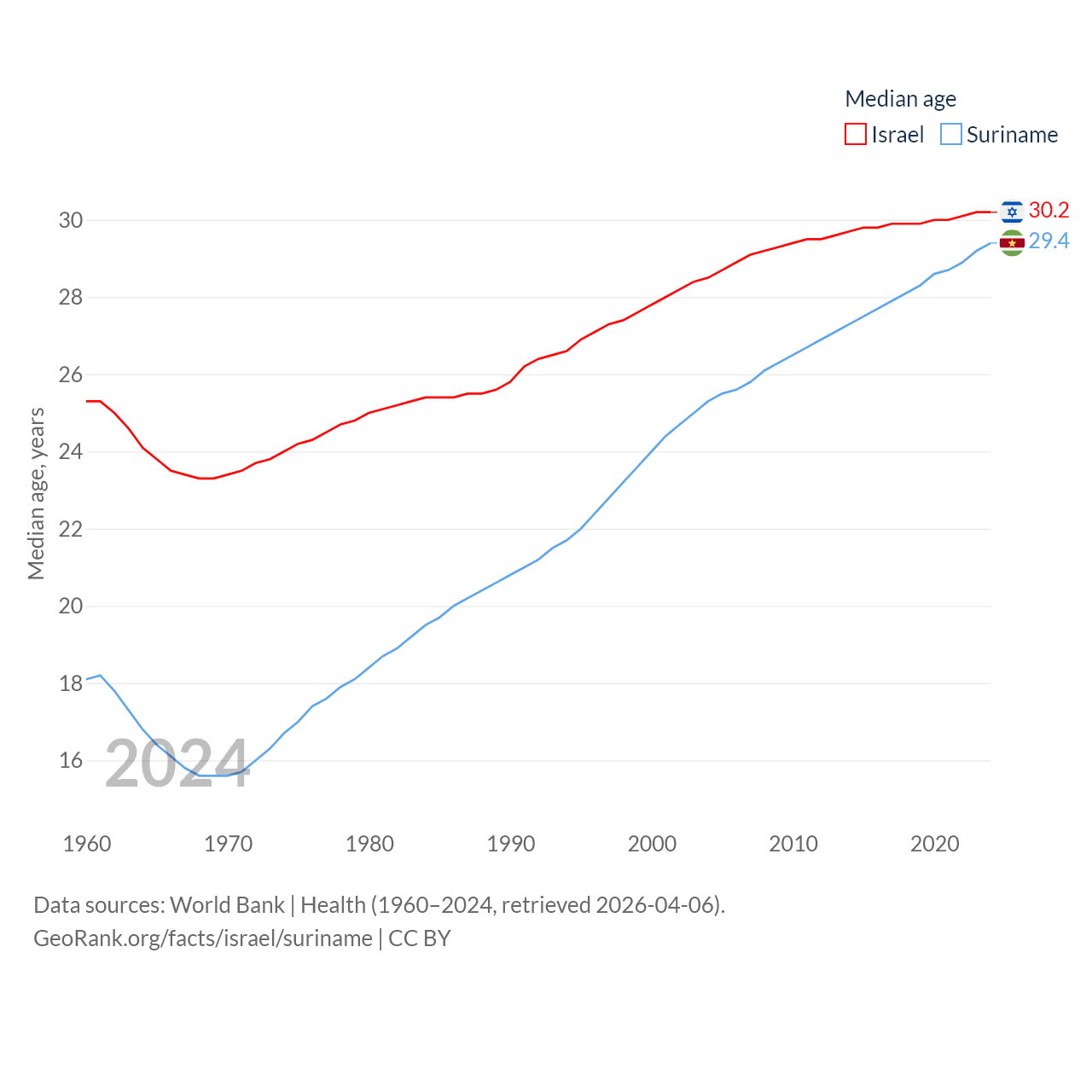 Israel has a population of 9.97M (ranked 96/197), compared with 634K in Suriname (ranked 165/197). Israel's land area is 8,355 sq mi versus 61,972 sq mi for Suriname (ranked 149th vs. 90th).