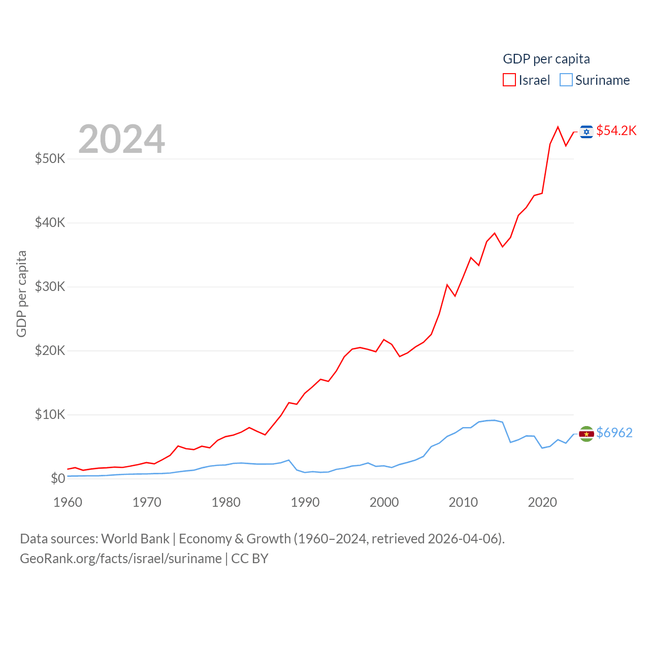 By GDP, Israel ranks 29/197 ($540B) and Suriname ranks 164/197 ($4.42B). By GDP per capita, Israel ranks 21/197 ($54,177), while Suriname ranks 102/197 ($6,962).
