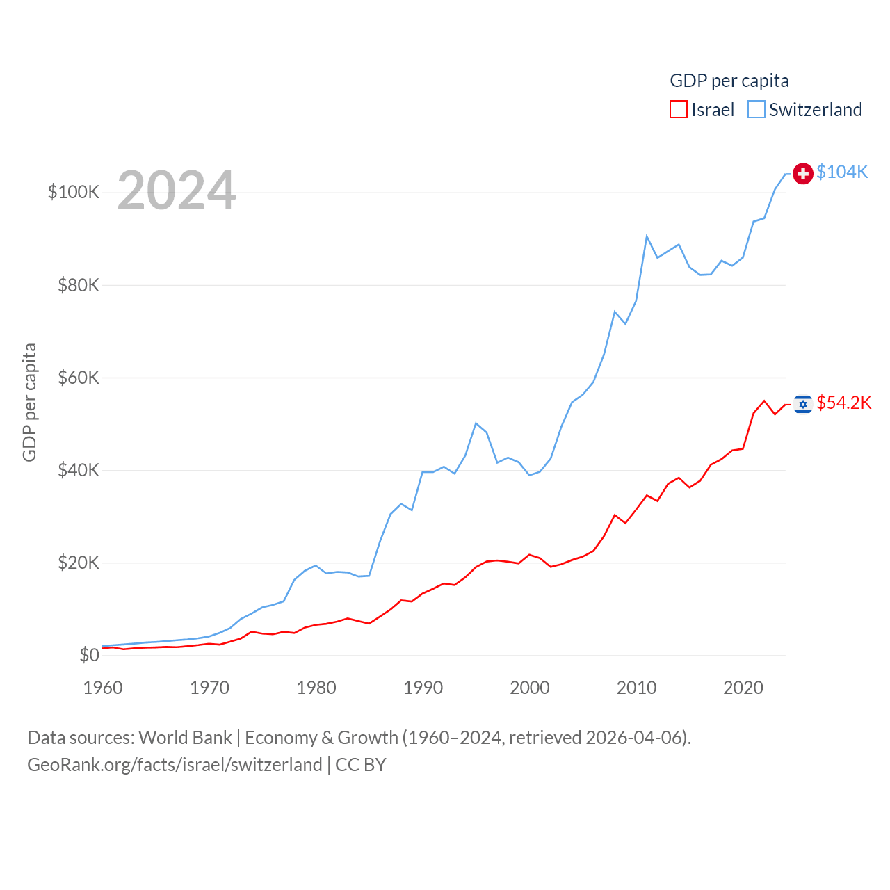 By GDP, Israel ranks 29/197 ($540B) and Switzerland ranks 20/197 ($937B). By GDP per capita, Israel ranks 21/197 ($54,177), while Switzerland ranks 5/197 ($103,998).