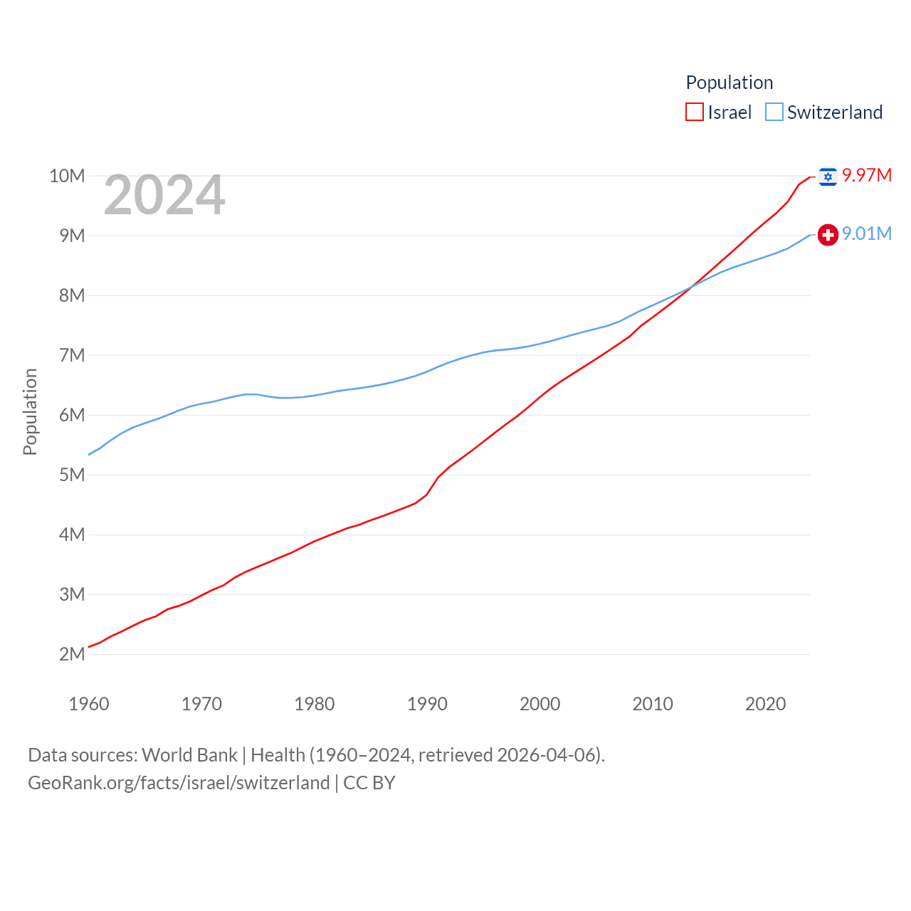 Israel has a population of 9.97M (ranked 96/197), compared with 9.01M in Switzerland (ranked 101/197). Israel's land area is 8,355 sq mi versus 15,255 sq mi for Switzerland (ranked 149th vs. 131st).