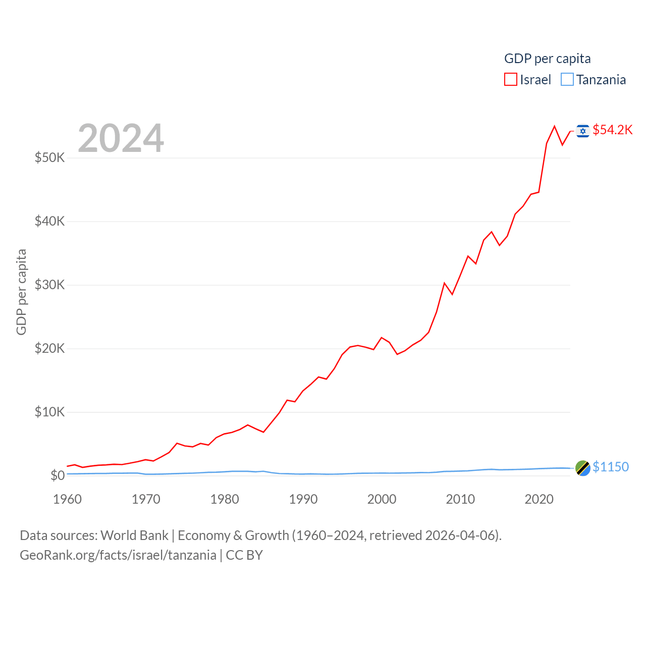 By GDP, Israel ranks 29/197 ($540B) and Tanzania ranks 82/197 ($78.8B). By GDP per capita, Israel ranks 21/197 ($54,177), while Tanzania ranks 170/197 ($1,150).