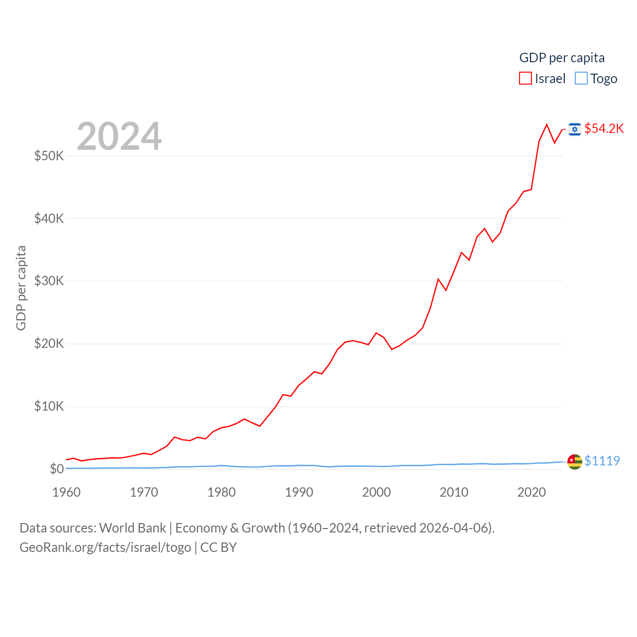 By GDP, Israel ranks 29/197 ($540B) and Togo ranks 154/197 ($10.7B). By GDP per capita, Israel ranks 21/197 ($54,177), while Togo ranks 172/197 ($1,119).