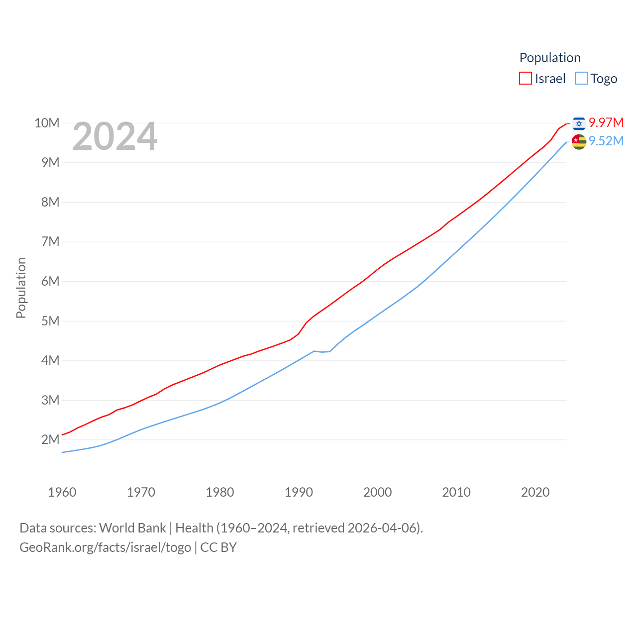 Israel has a population of 9.97M (ranked 96/197), compared with 9.52M in Togo (ranked 98/197). Israel's land area is 8,355 sq mi versus 21,000 sq mi for Togo (ranked 149th vs. 124th).
