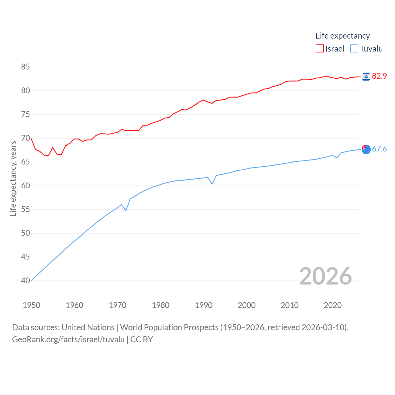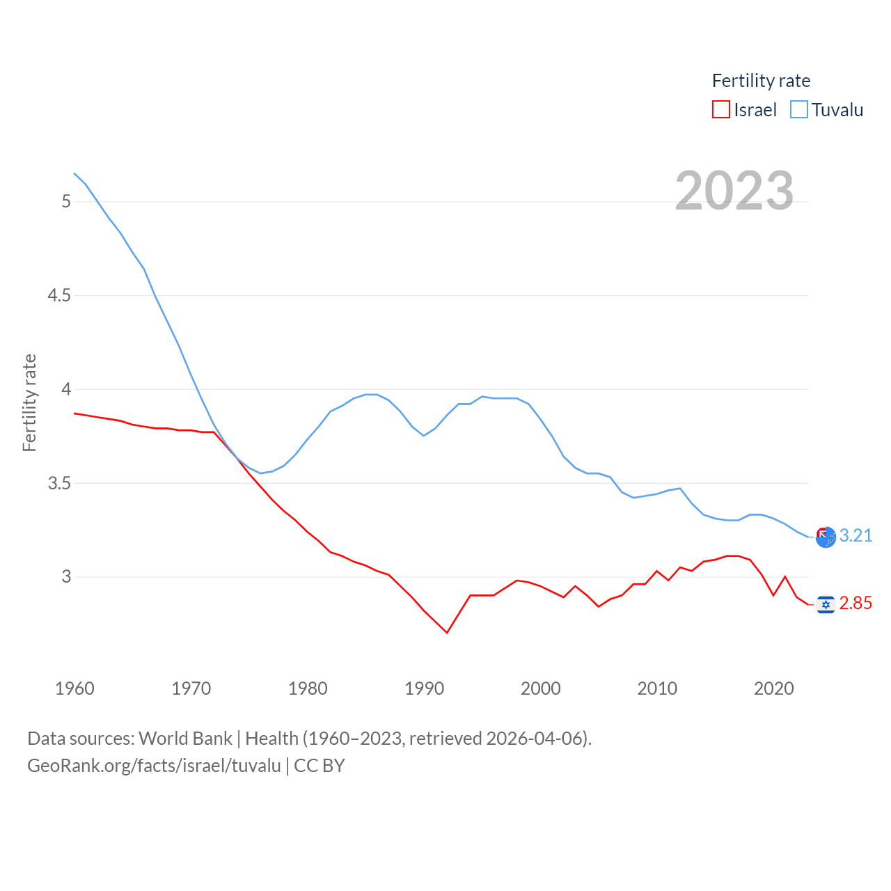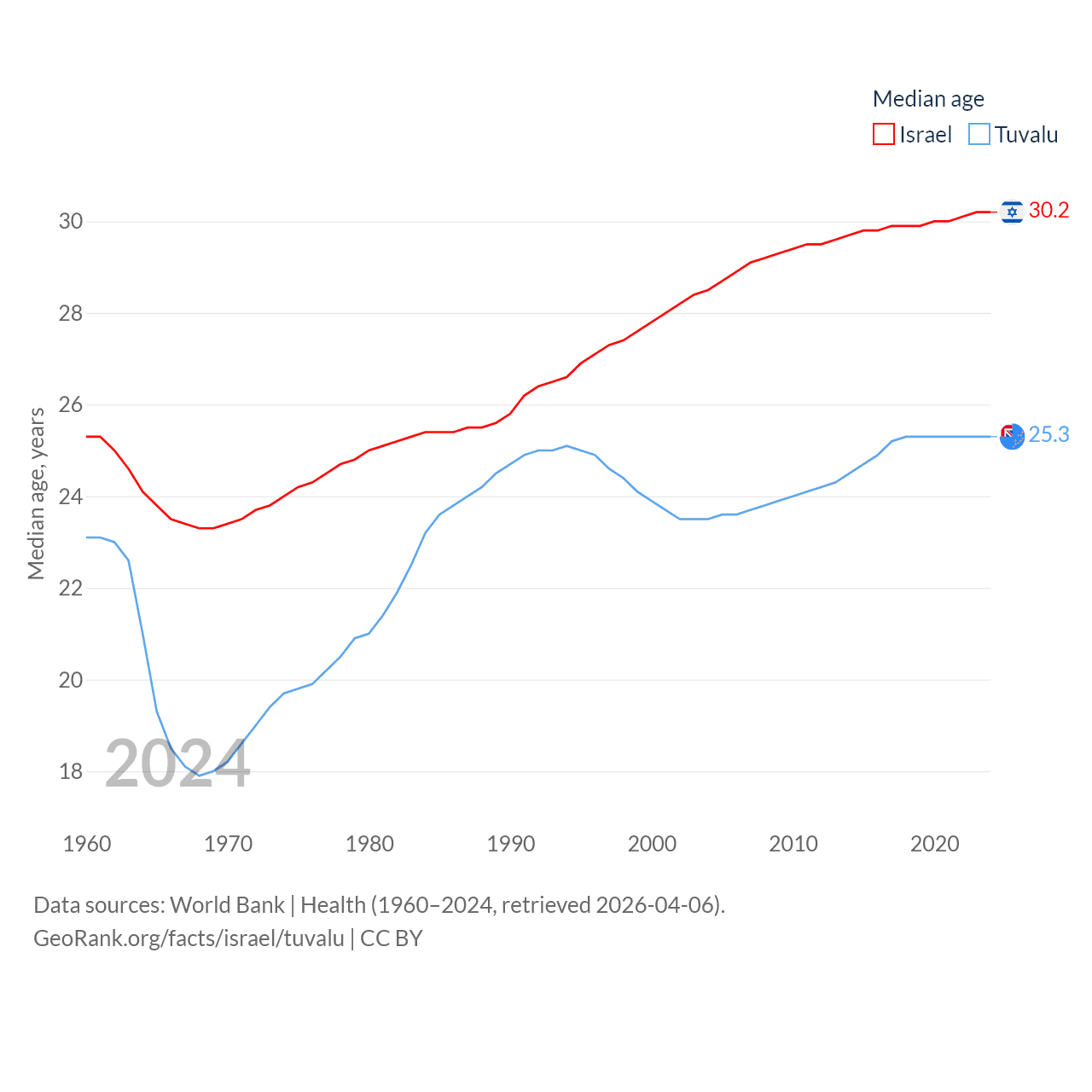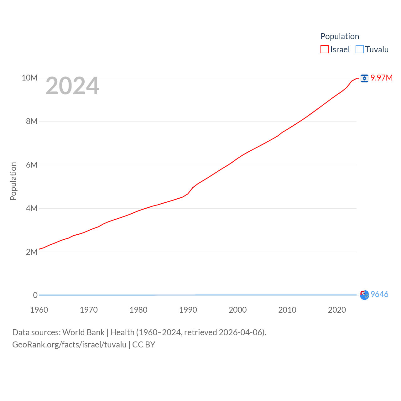 Israel has a population of 9.97M (ranked 96/197), compared with 9.65K in Tuvalu (ranked 196/197). Israel's land area is 8,355 sq mi versus 11.6 sq mi for Tuvalu (ranked 149th vs. 194th).