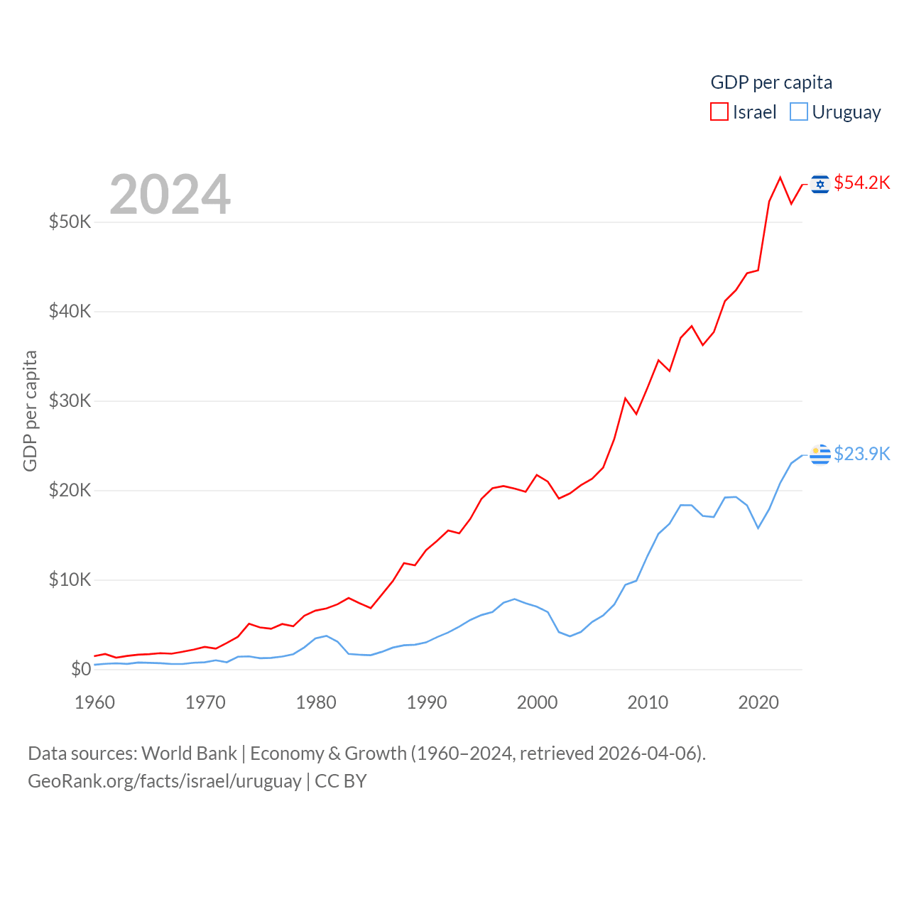 By GDP, Israel ranks 29/197 ($540B) and Uruguay ranks 81/197 ($81B). By GDP per capita, Israel ranks 21/197 ($54,177), while Uruguay ranks 52/197 ($23,907).