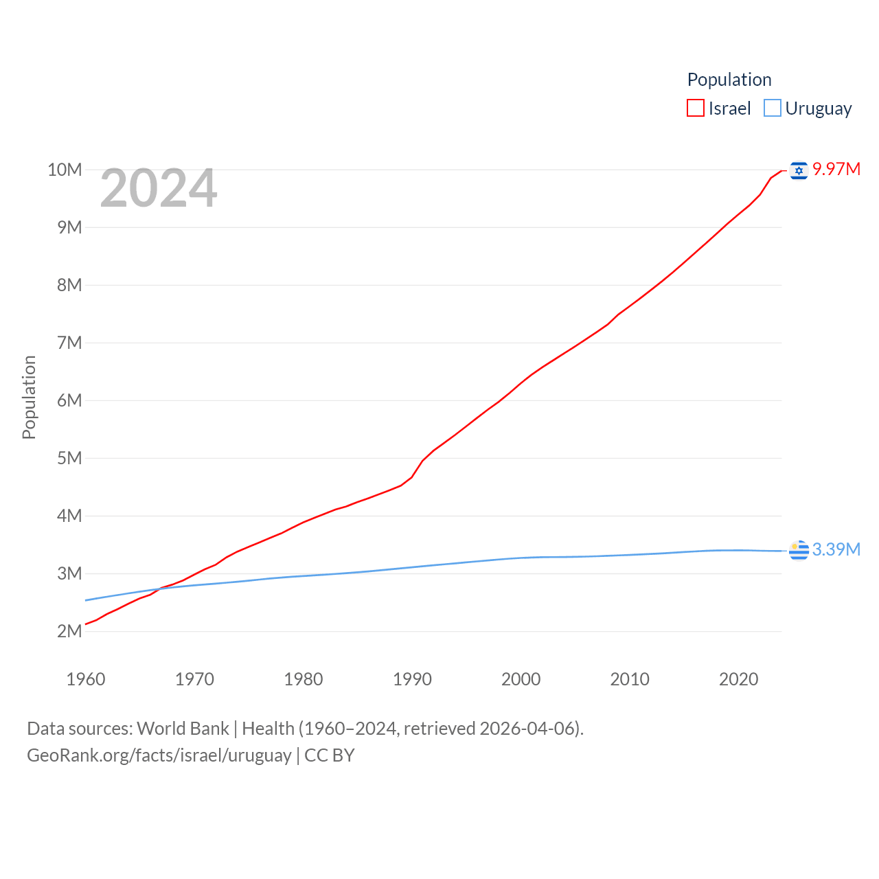 Israel has a population of 9.97M (ranked 96/197), compared with 3.39M in Uruguay (ranked 133/197). Israel's land area is 8,355 sq mi versus 67,576 sq mi for Uruguay (ranked 149th vs. 89th).