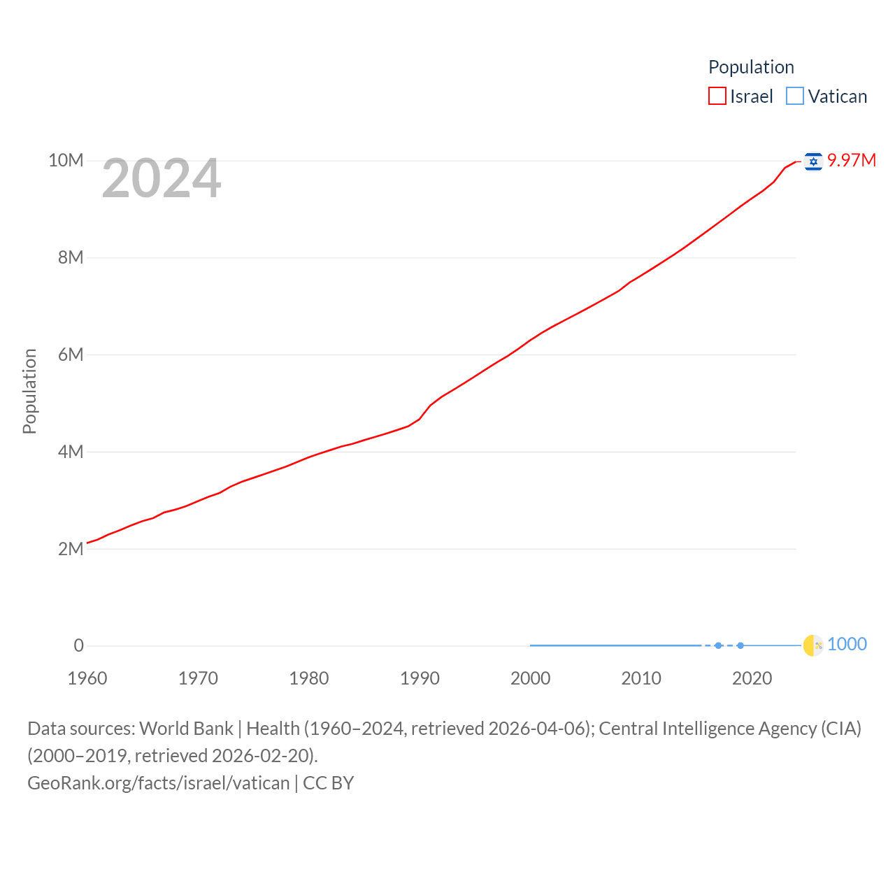 Israel has a population of 9.97M (ranked 96/197), compared with 1K in The Vatican (ranked 197/197). Israel's land area is 8,355 sq mi versus 0.17 sq mi for The Vatican (ranked 149th vs. 197th).