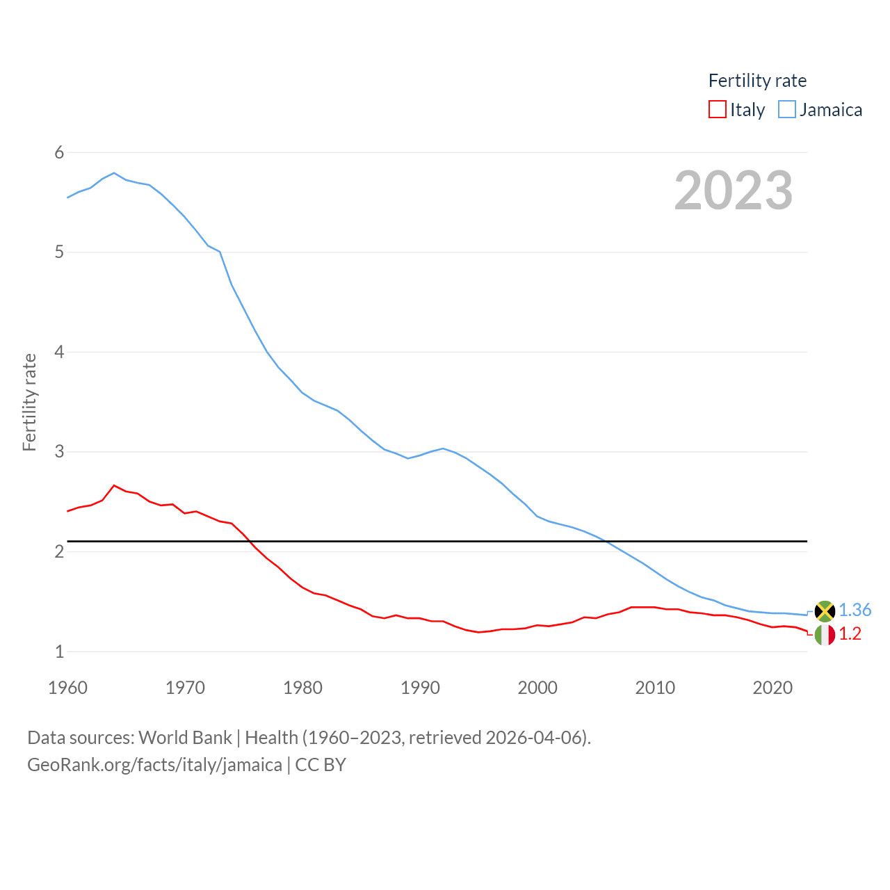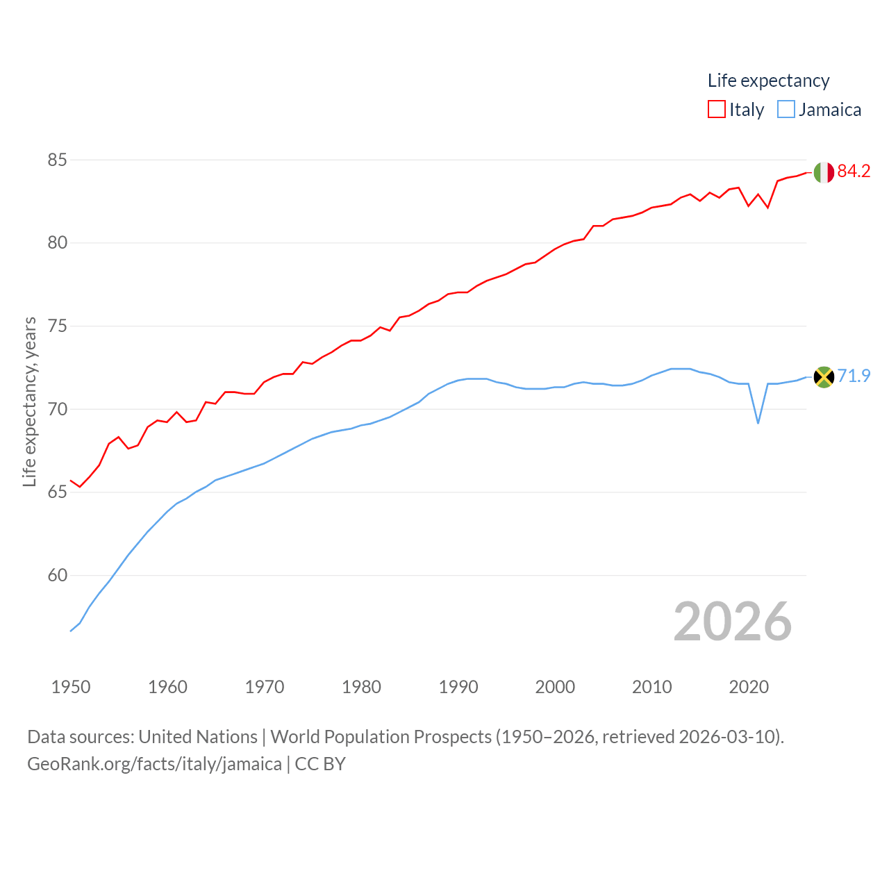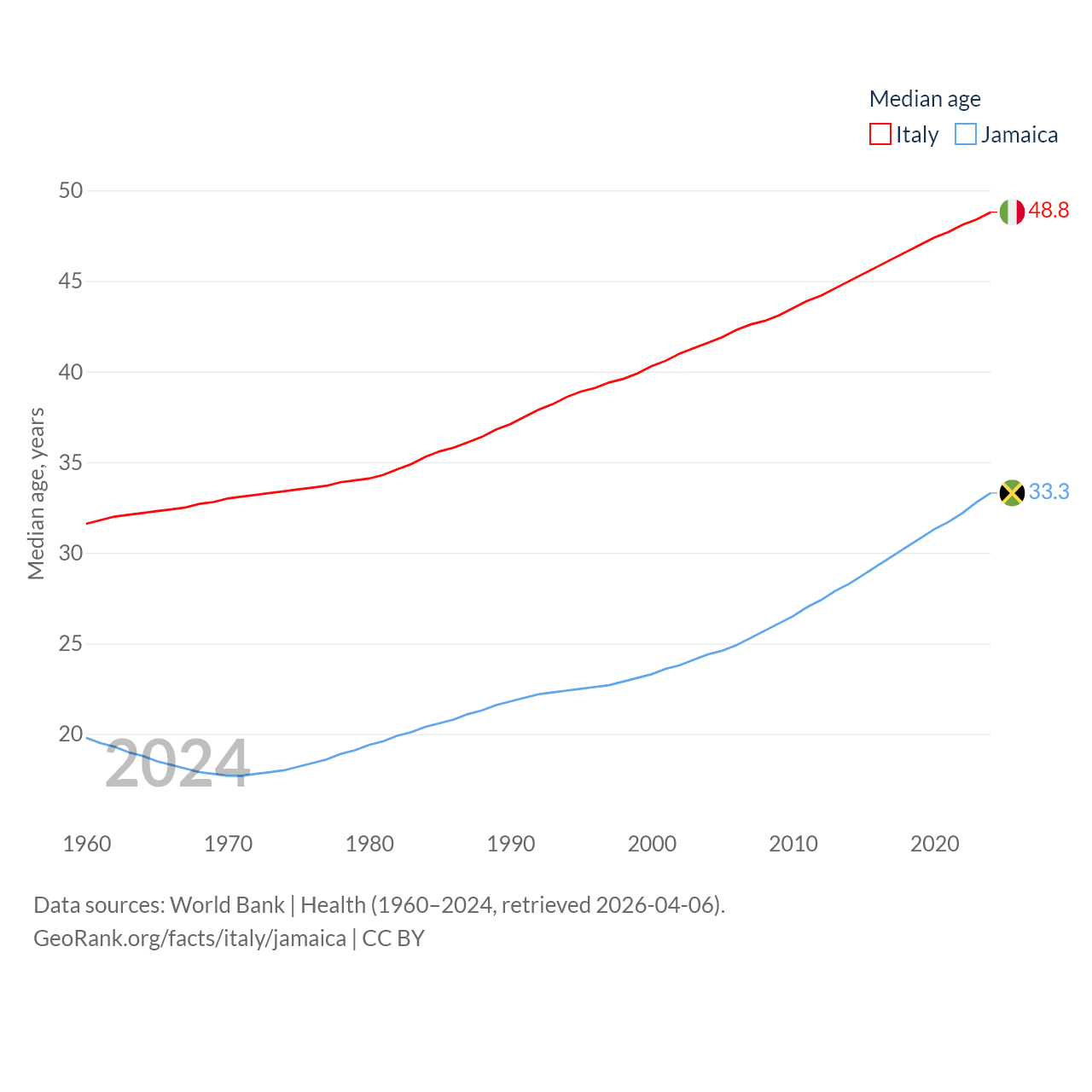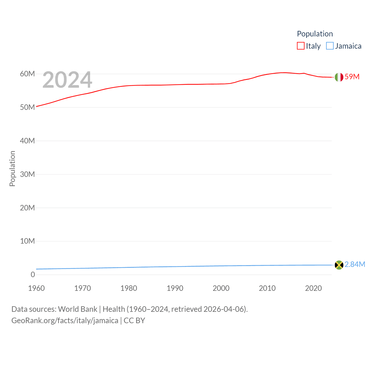 Italy has a population of 59M (ranked 25/197), compared with 2.84M in Jamaica (ranked 139/197). Italy's land area is 114,178 sq mi versus 4,181 sq mi for Jamaica (ranked 72nd vs. 159th).