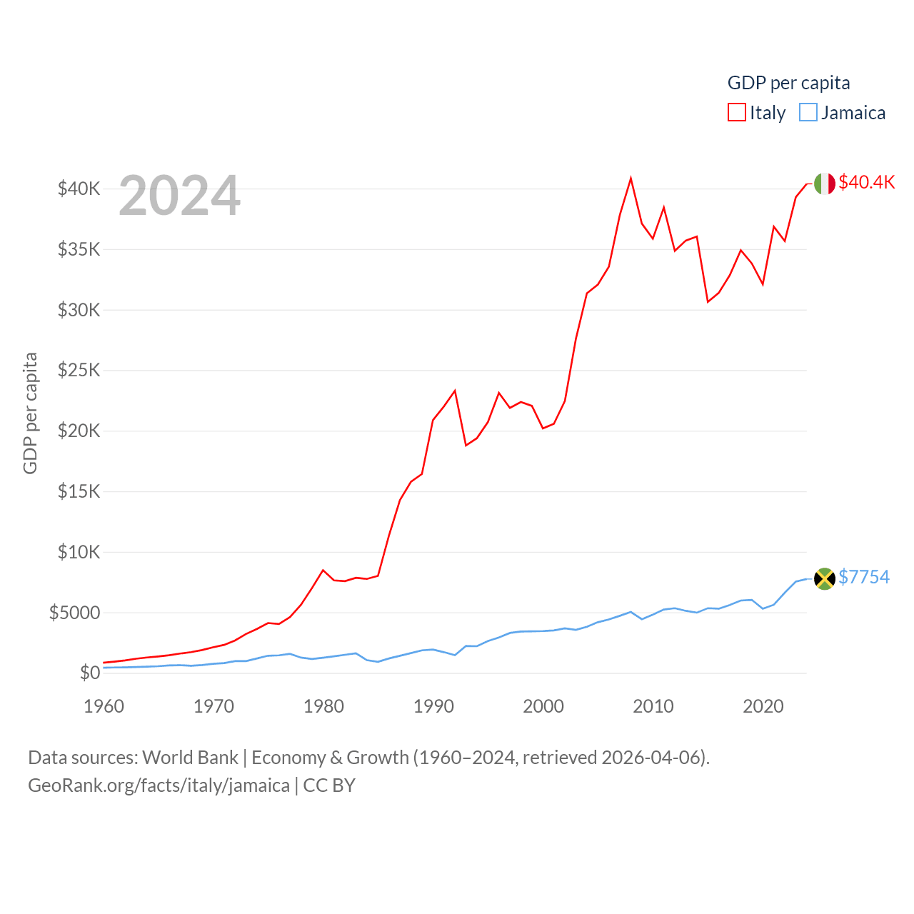 By GDP, Italy ranks 8/197 ($2.38T) and Jamaica ranks 124/197 ($22B). By GDP per capita, Italy ranks 29/197 ($40,385), while Jamaica ranks 95/197 ($7,754).