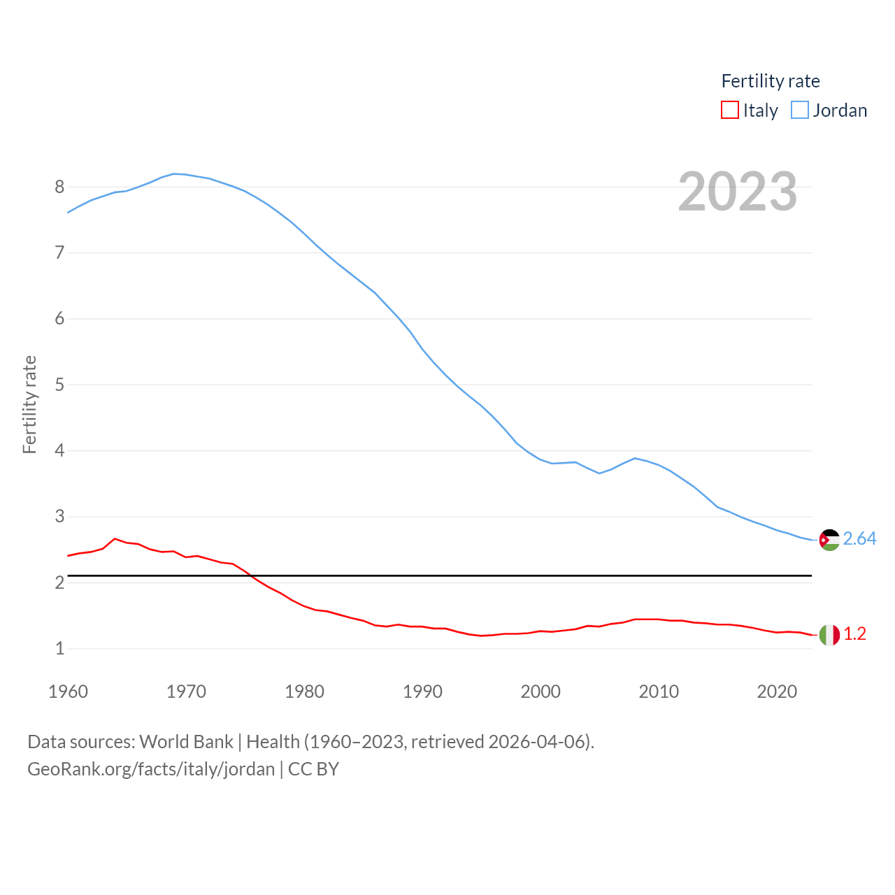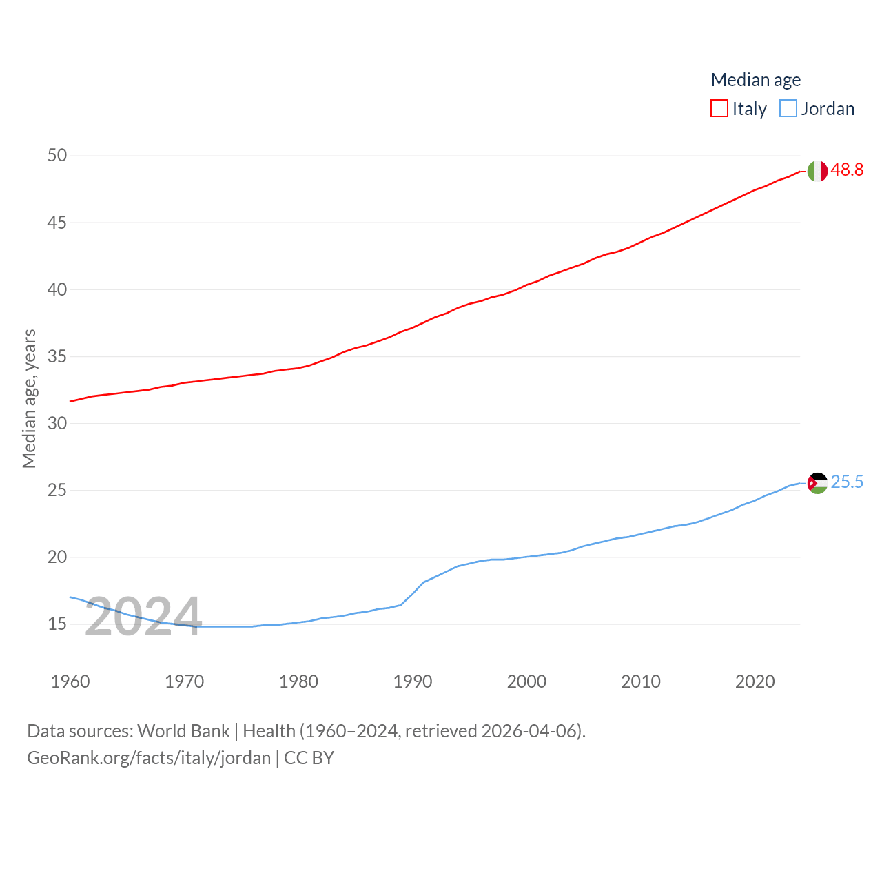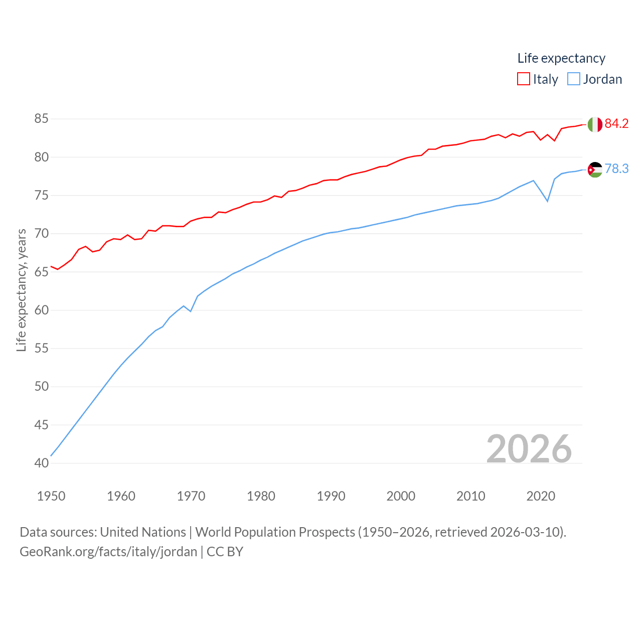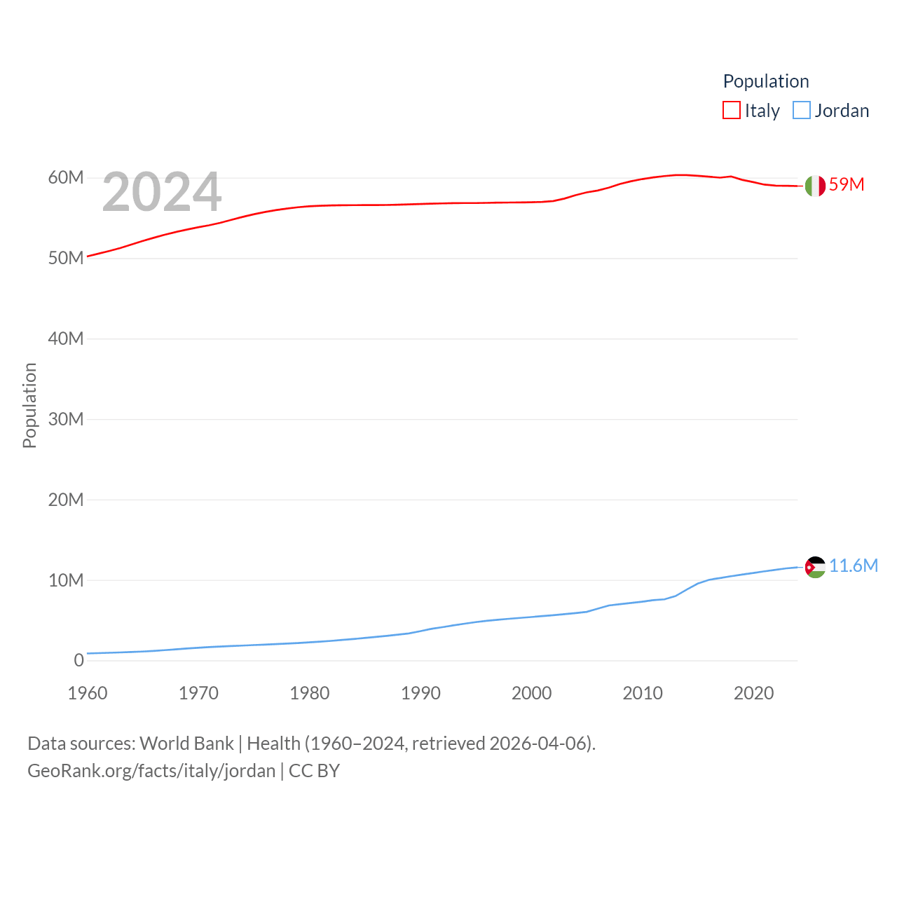Italy has a population of 59M (ranked 25/197), compared with 11.6M in Jordan (ranked 84/197). Italy's land area is 114,178 sq mi versus 34,284 sq mi for Jordan (ranked 72nd vs. 110th).