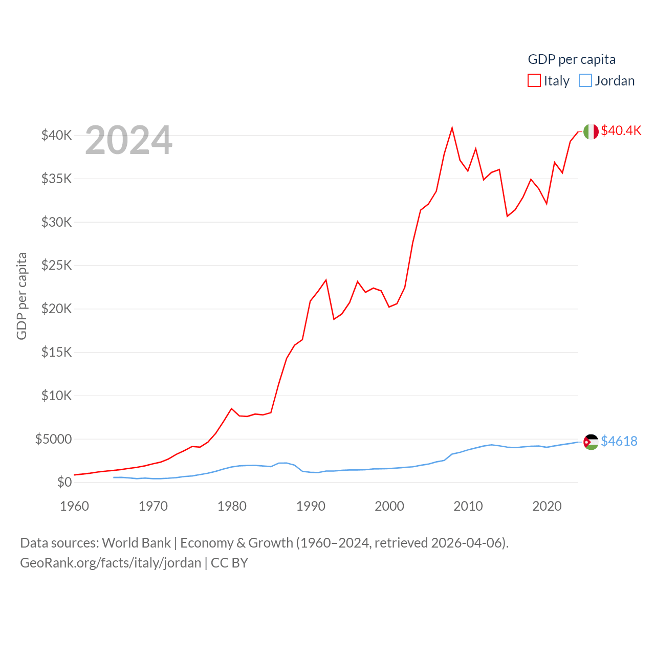 By GDP, Italy ranks 8/197 ($2.38T) and Jordan ranks 90/197 ($53.4B). By GDP per capita, Italy ranks 29/197 ($40,385), while Jordan ranks 123/197 ($4,618).