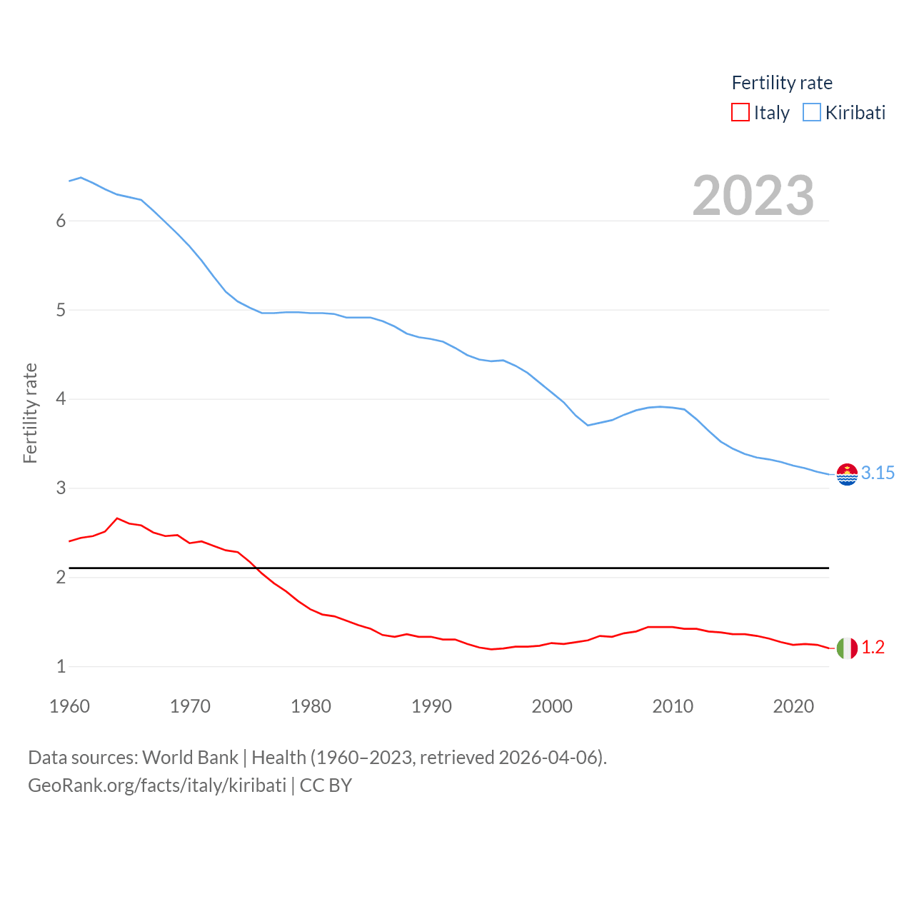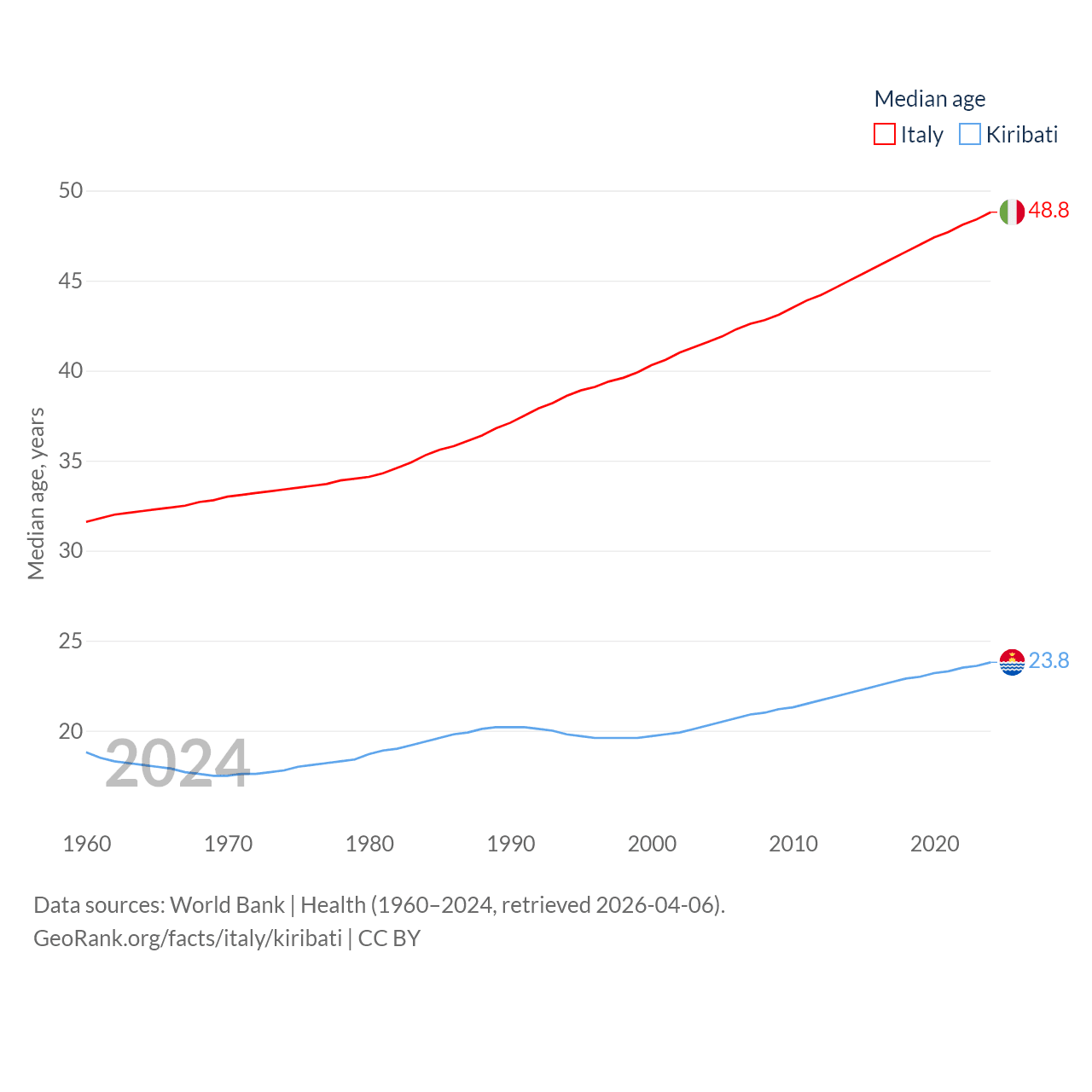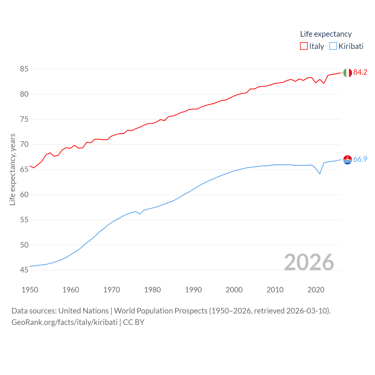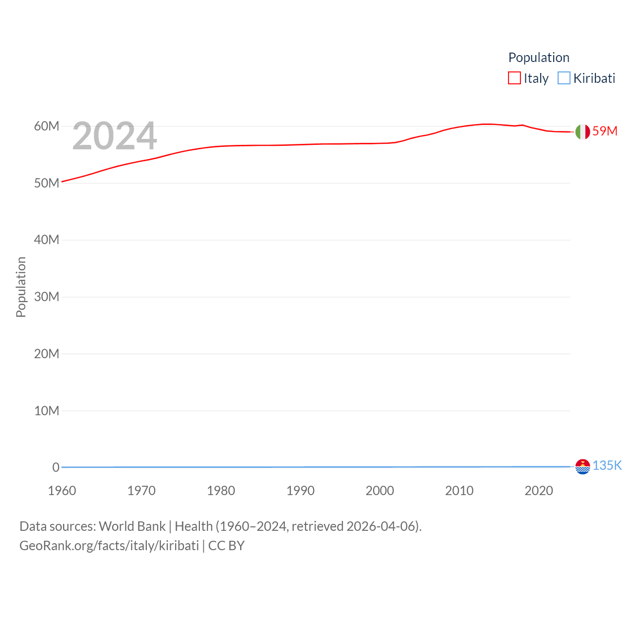 Italy has a population of 59M (ranked 25/197), compared with 135K in Kiribati (ranked 180/197). Italy's land area is 114,178 sq mi versus 313 sq mi for Kiribati (ranked 72nd vs. 173rd).
