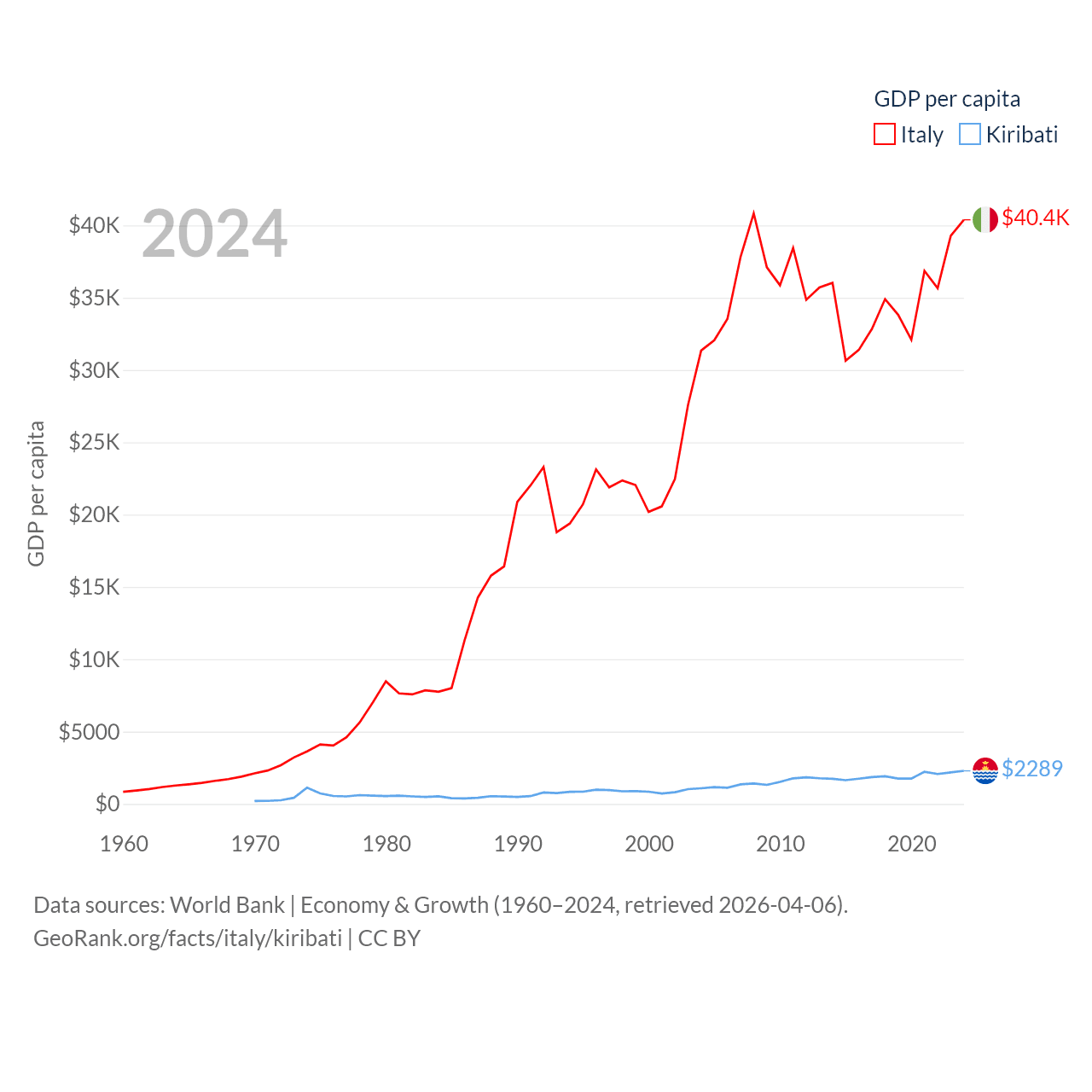 By GDP, Italy ranks 8/197 ($2.38T) and Kiribati ranks 192/197 ($308M). By GDP per capita, Italy ranks 29/197 ($40,385), while Kiribati ranks 152/197 ($2,289).
