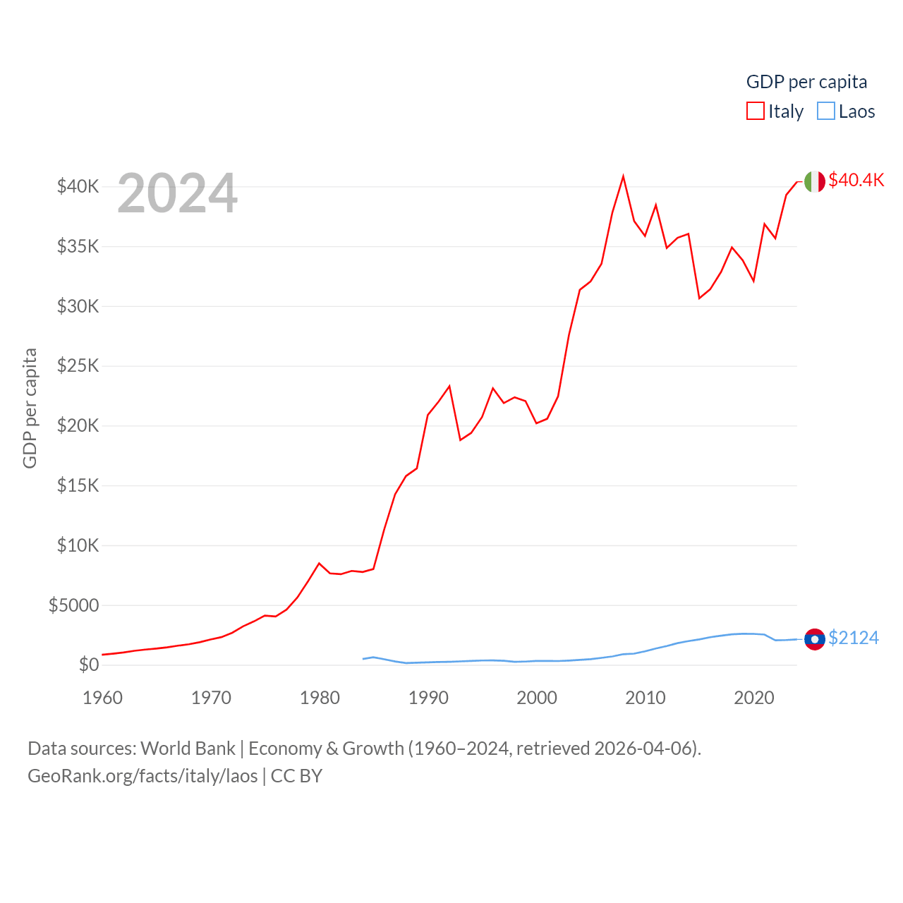 By GDP, Italy ranks 8/197 ($2.38T) and Laos ranks 139/197 ($16.5B). By GDP per capita, Italy ranks 29/197 ($40,385), while Laos ranks 155/197 ($2,124).