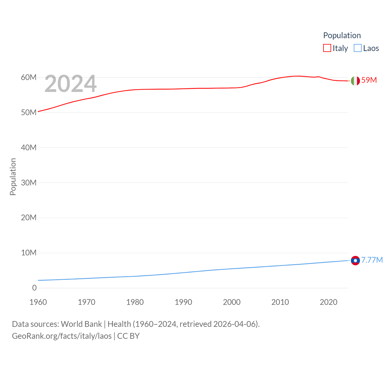 Italy has a population of 59M (ranked 25/197), compared with 7.77M in Laos (ranked 103/197). Italy's land area is 114,178 sq mi versus 89,112 sq mi for Laos (ranked 72nd vs. 79th).