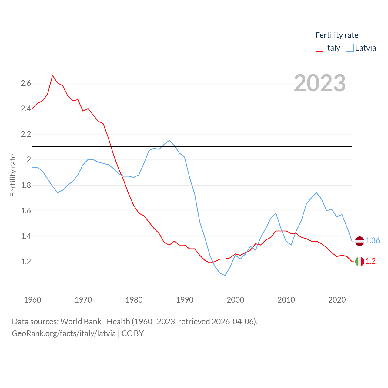 Italy has a population of 59M (ranked 25/197), compared with 1.87M in Latvia (ranked 149/197). Italy's land area is 114,178 sq mi versus 24,027 sq mi for Latvia (ranked 72nd vs. 121st).
