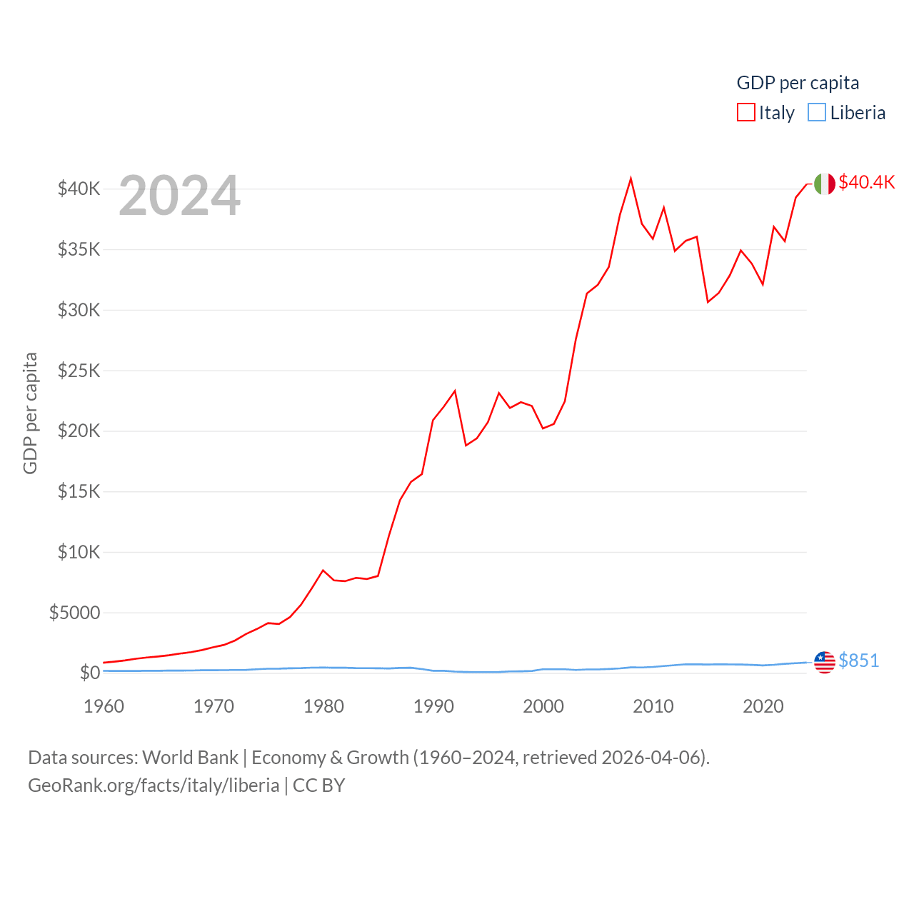 By GDP, Italy ranks 8/197 ($2.38T) and Liberia ranks 163/197 ($4.78B). By GDP per capita, Italy ranks 29/197 ($40,385), while Liberia ranks 184/197 ($851).
