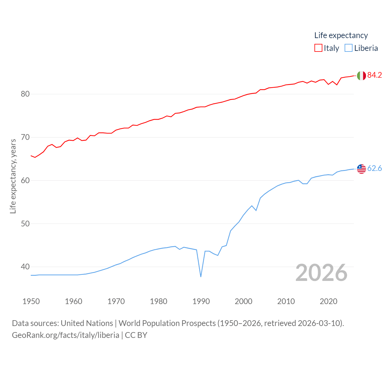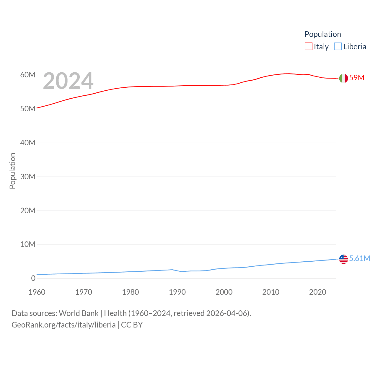 Italy has a population of 59M (ranked 25/197), compared with 5.61M in Liberia (ranked 117/197). Italy's land area is 114,178 sq mi versus 37,189 sq mi for Liberia (ranked 72nd vs. 106th).
