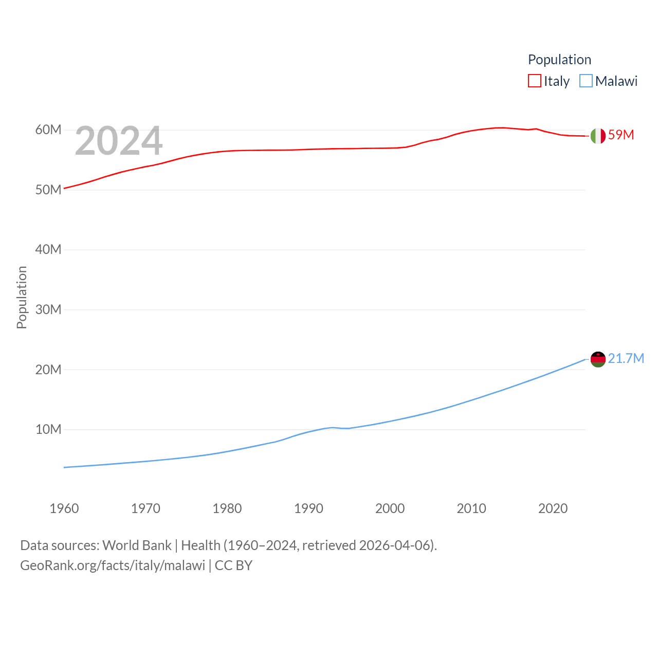 Italy has a population of 59M (ranked 25/197), compared with 21.7M in Malawi (ranked 62/197). Italy's land area is 114,178 sq mi versus 36,402 sq mi for Malawi (ranked 72nd vs. 107th).