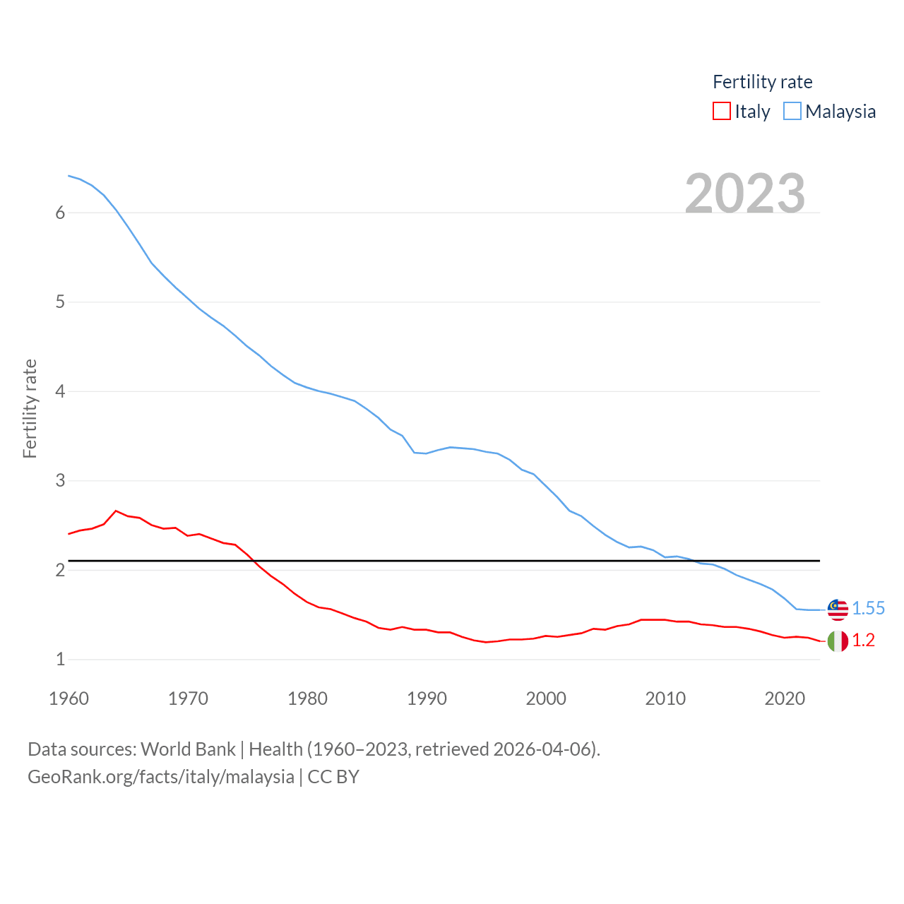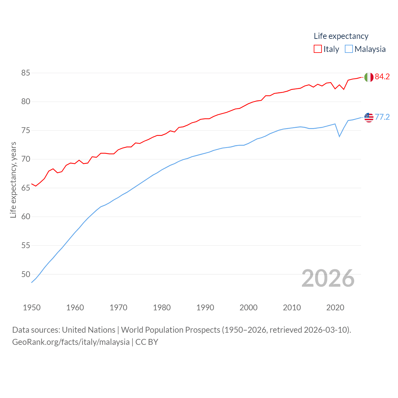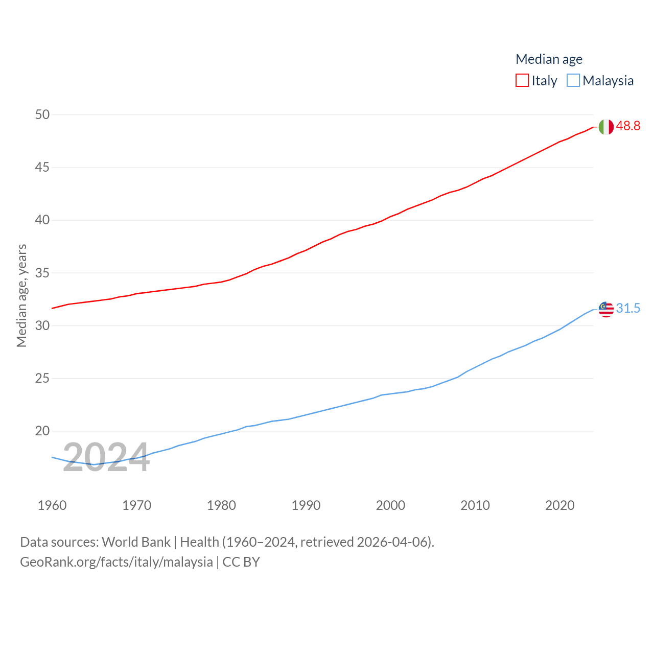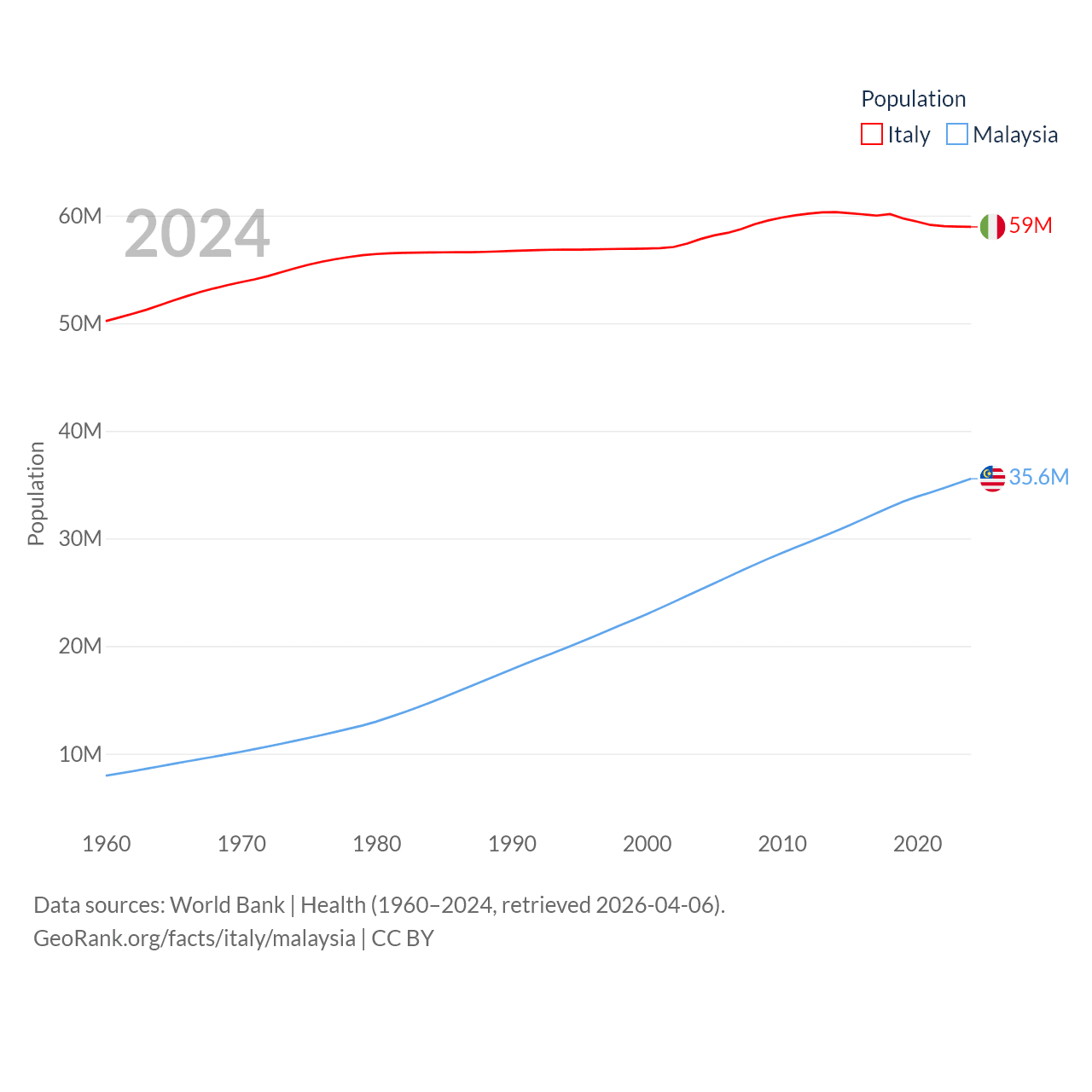 Italy has a population of 59M (ranked 25/197), compared with 35.6M in Malaysia (ranked 44/197). Italy's land area is 114,178 sq mi versus 126,854 sq mi for Malaysia (ranked 72nd vs. 65th).