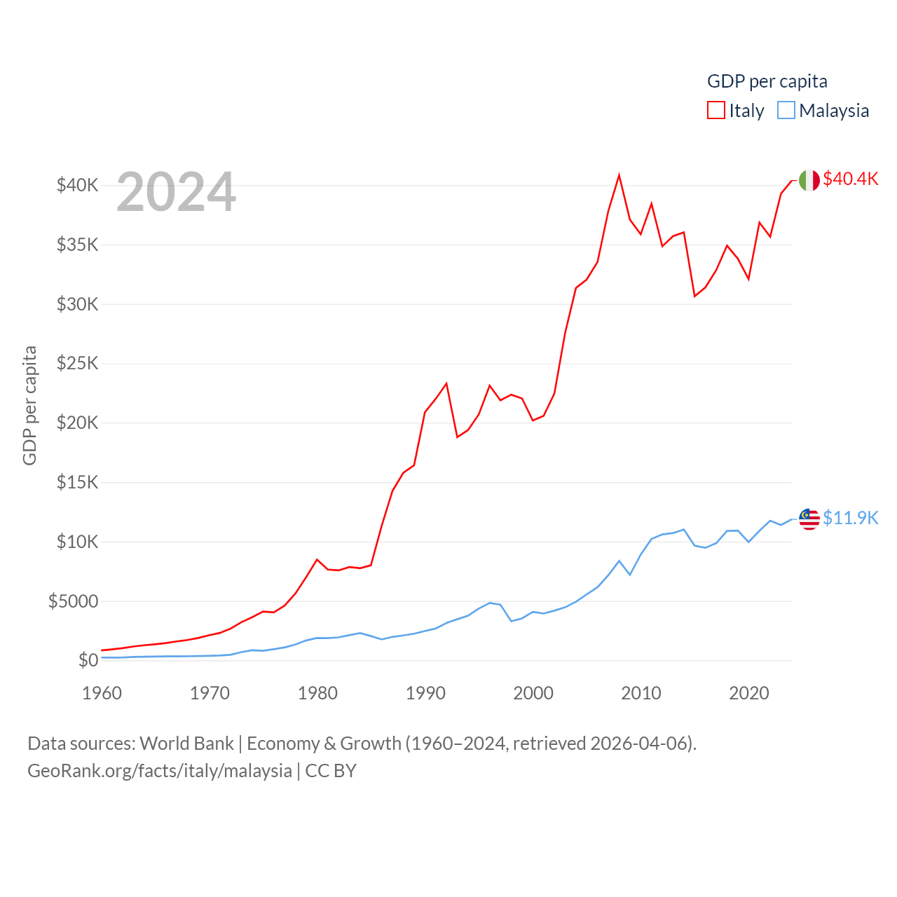 By GDP, Italy ranks 8/197 ($2.38T) and Malaysia ranks 38/197 ($422B). By GDP per capita, Italy ranks 29/197 ($40,385), while Malaysia ranks 79/197 ($11,874).
