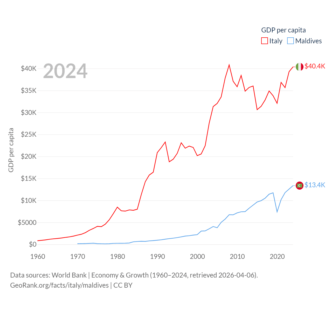 By GDP, Italy ranks 8/197 ($2.38T) and Maldives ranks 159/197 ($7.06B). By GDP per capita, Italy ranks 29/197 ($40,385), while Maldives ranks 75/197 ($13,379).