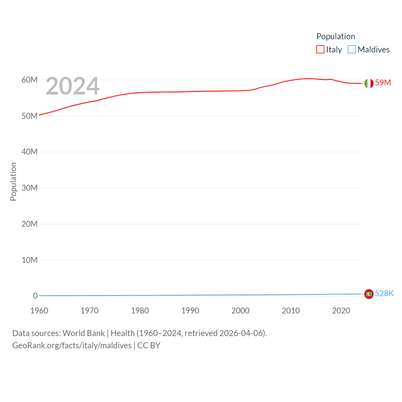 Italy has a population of 59M (ranked 25/197), compared with 528K in Maldives (ranked 168/197). Italy's land area is 114,178 sq mi versus 115.1 sq mi for Maldives (ranked 72nd vs. 188th).