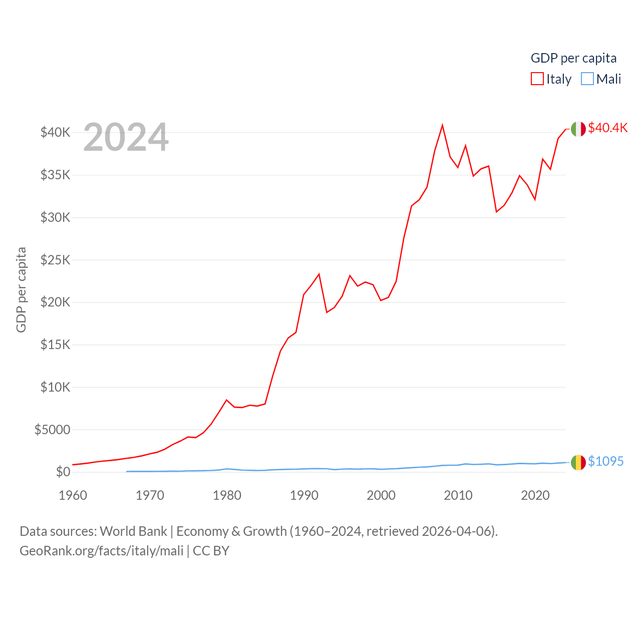 By GDP, Italy ranks 8/197 ($2.38T) and Mali ranks 113/197 ($26.8B). By GDP per capita, Italy ranks 29/197 ($40,385), while Mali ranks 173/197 ($1,095).