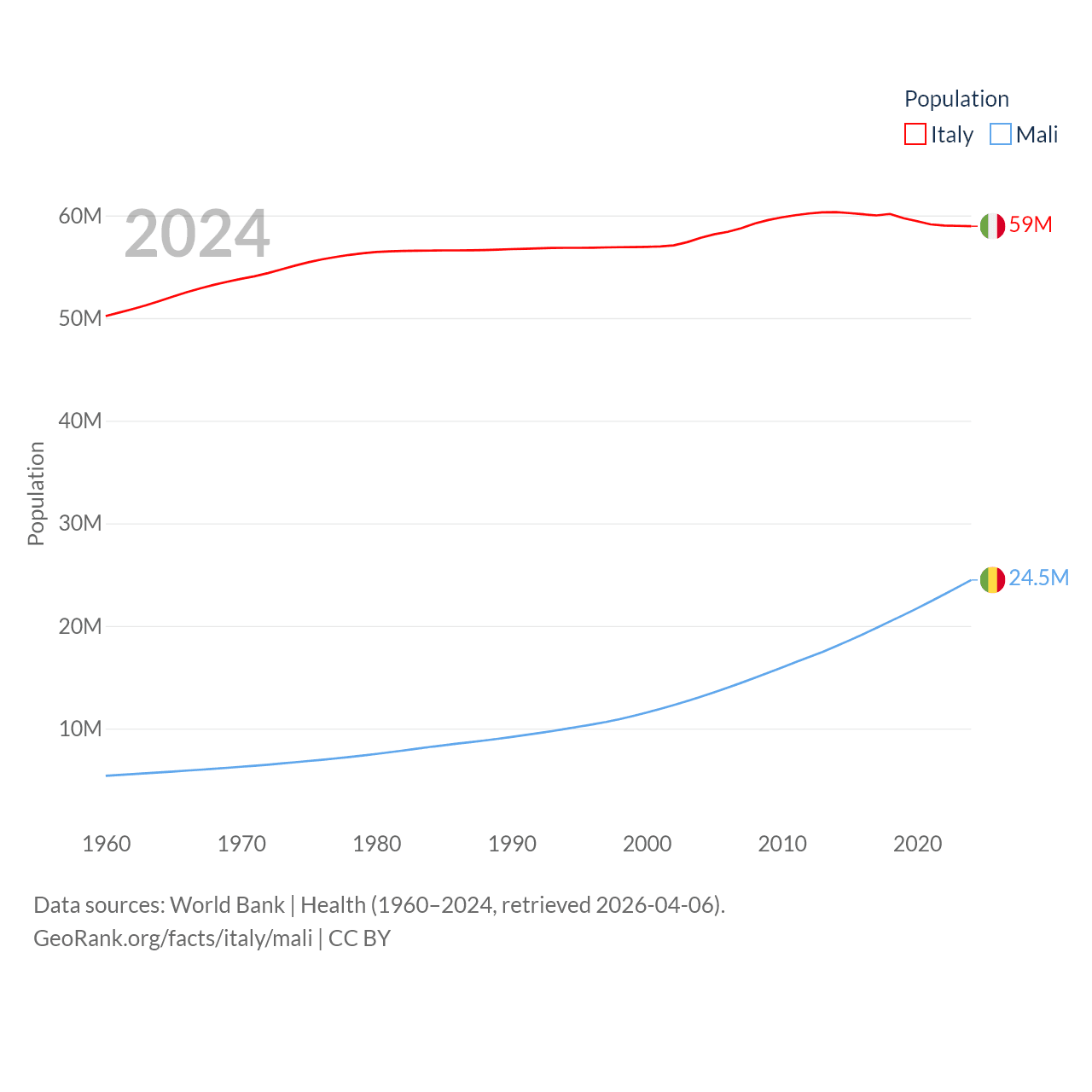 Italy has a population of 59M (ranked 25/197), compared with 24.5M in Mali (ranked 58/197). Italy's land area is 114,178 sq mi versus 471,118 sq mi for Mali (ranked 72nd vs. 23rd).