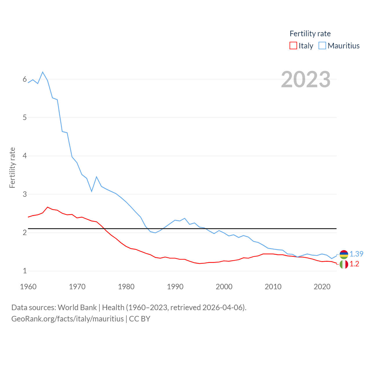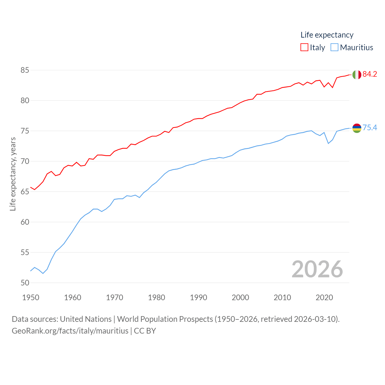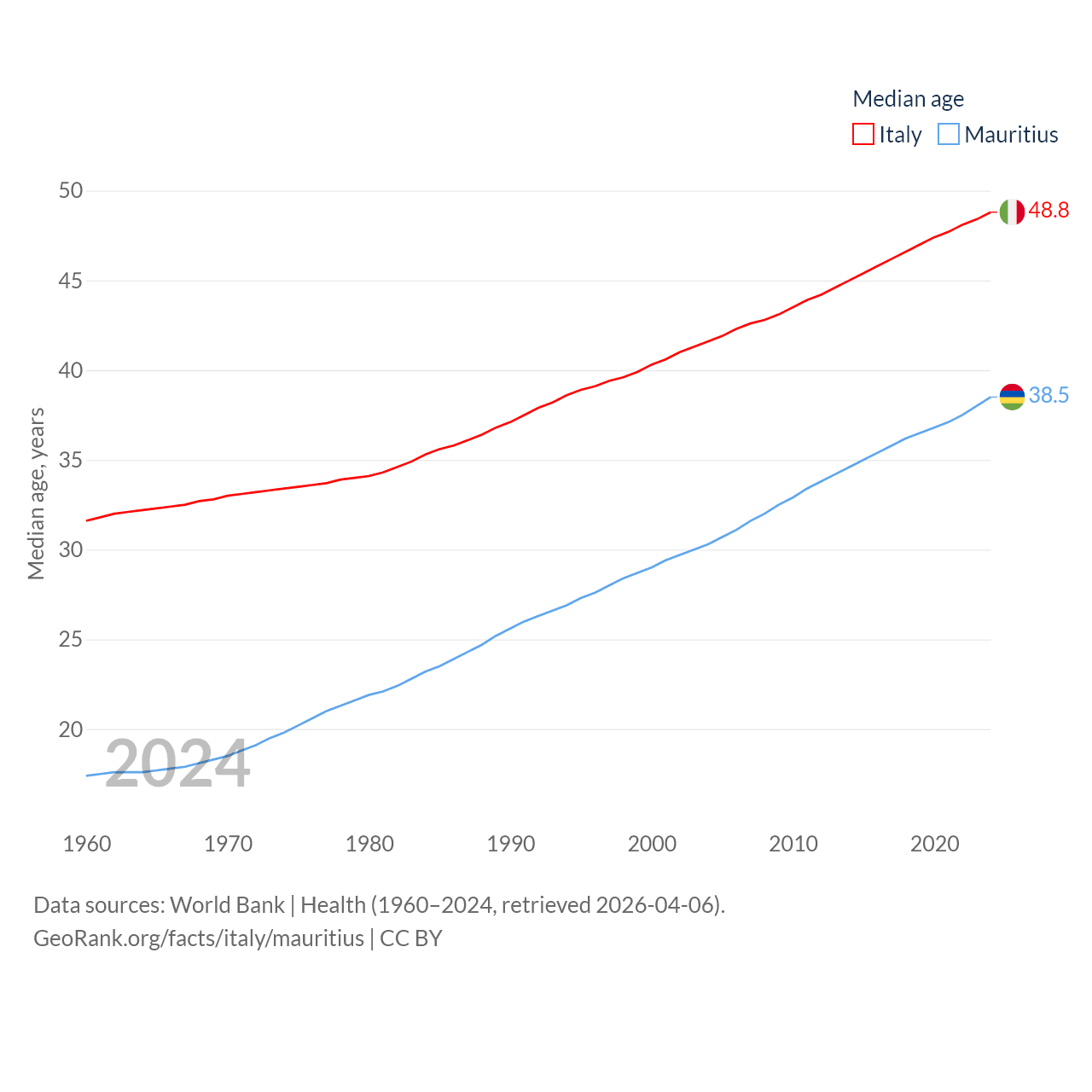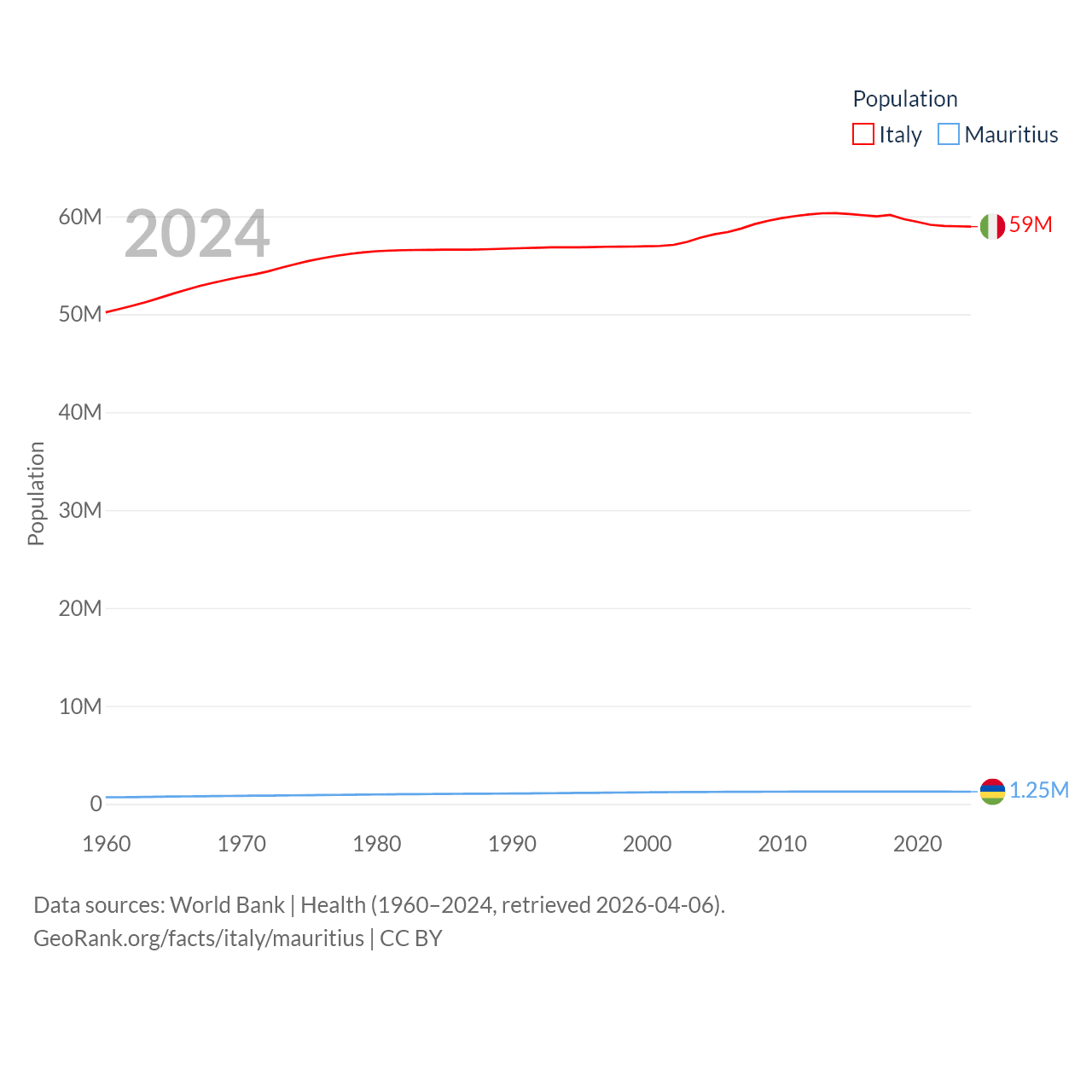 Italy has a population of 59M (ranked 25/197), compared with 1.25M in Mauritius (ranked 156/197). Italy's land area is 114,178 sq mi versus 771 sq mi for Mauritius (ranked 72nd vs. 170th).