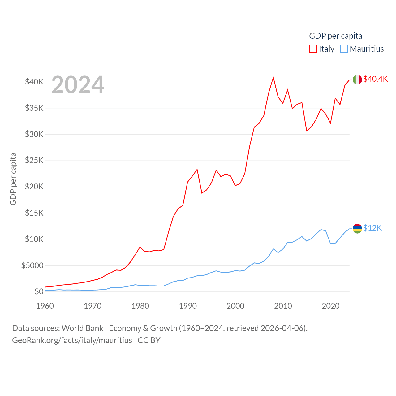 By GDP, Italy ranks 8/197 ($2.38T) and Mauritius ranks 143/197 ($14.9B). By GDP per capita, Italy ranks 29/197 ($40,385), while Mauritius ranks 78/197 ($11,991).