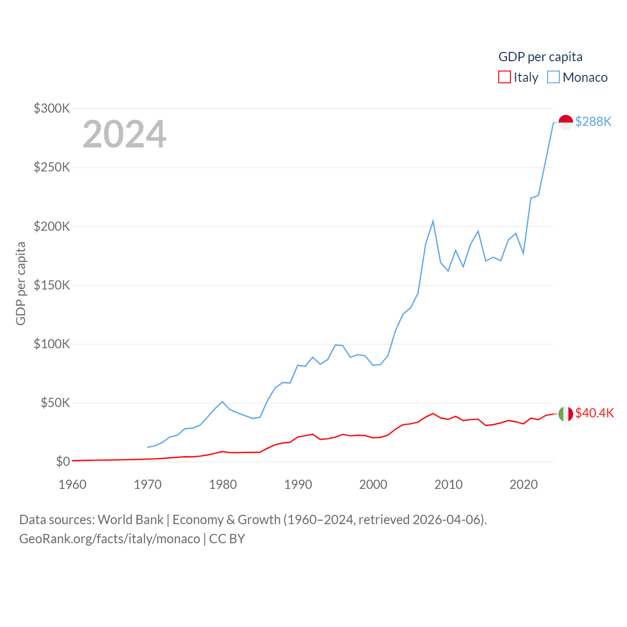 By GDP, Italy ranks 8/197 ($2.38T) and Monaco ranks 152/197 ($11.1B). By GDP per capita, Italy ranks 29/197 ($40,385), while Monaco ranks 1/197 ($288,001).