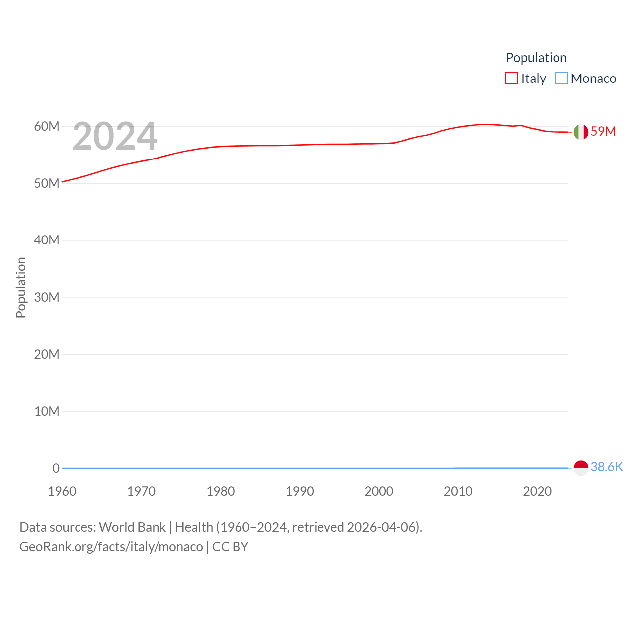 Italy has a population of 59M (ranked 25/197), compared with 38.6K in Monaco (ranked 191/197). Italy's land area is 114,178 sq mi versus 0.8 sq mi for Monaco (ranked 72nd vs. 196th).