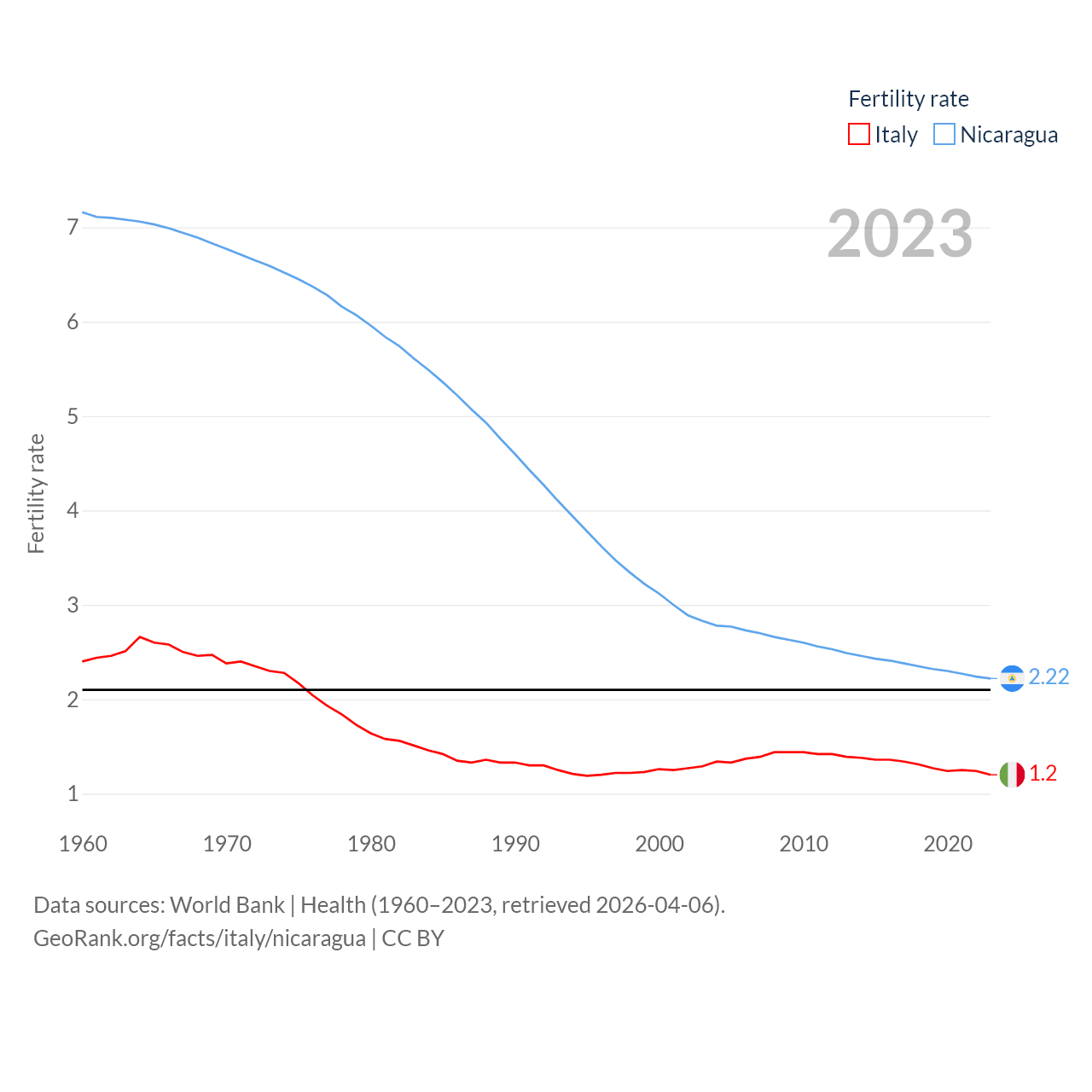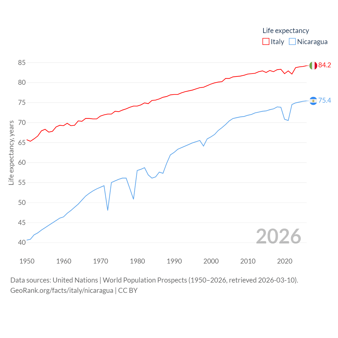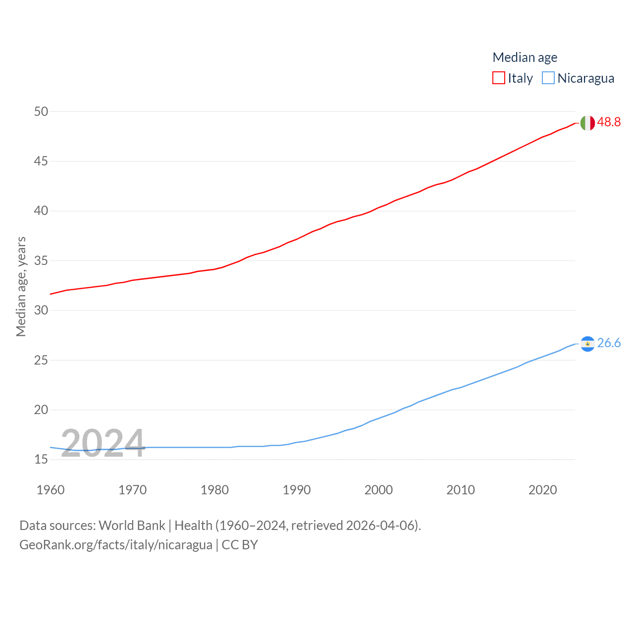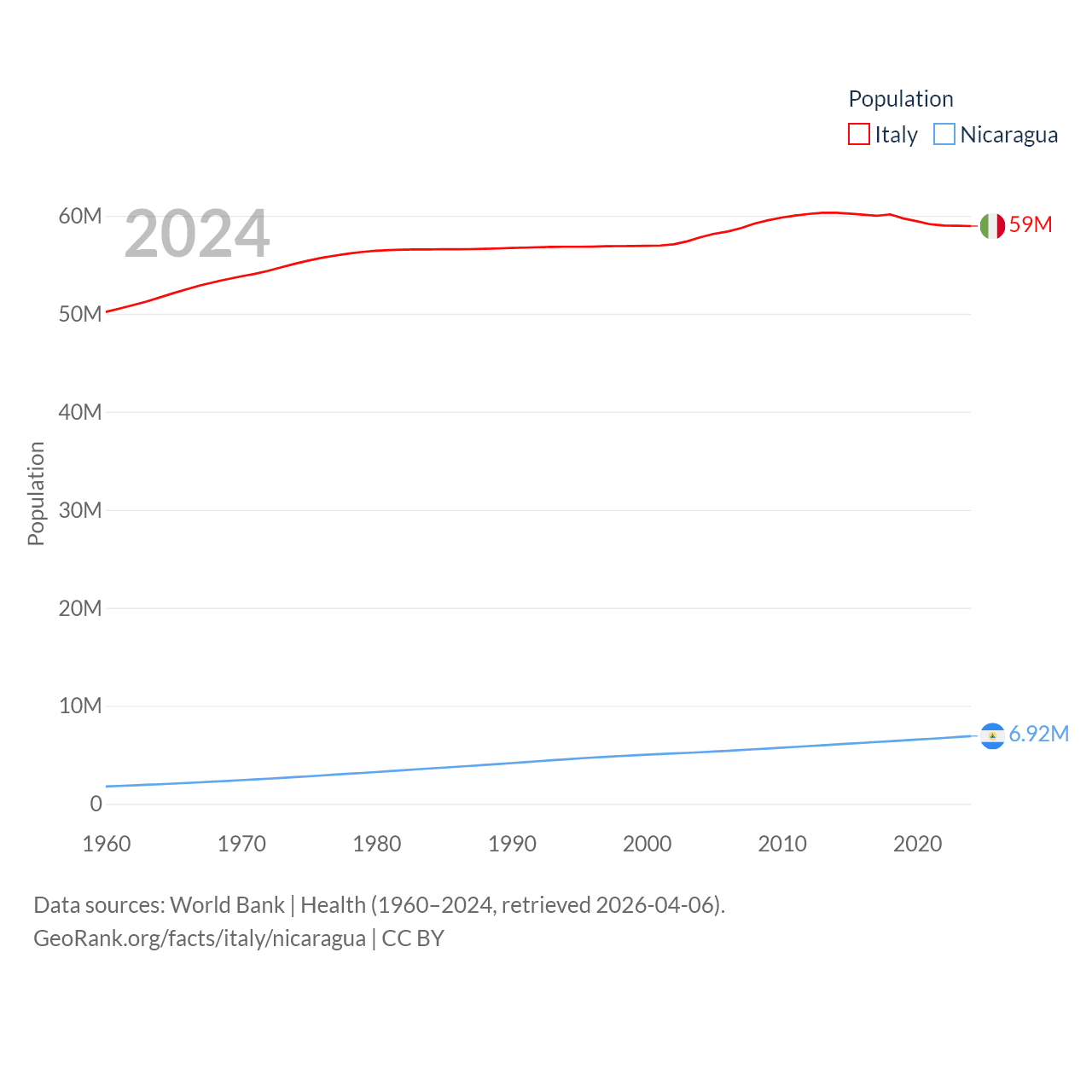 Italy has a population of 59M (ranked 25/197), compared with 6.92M in Nicaragua (ranked 108/197). Italy's land area is 114,178 sq mi versus 46,464 sq mi for Nicaragua (ranked 72nd vs. 98th).