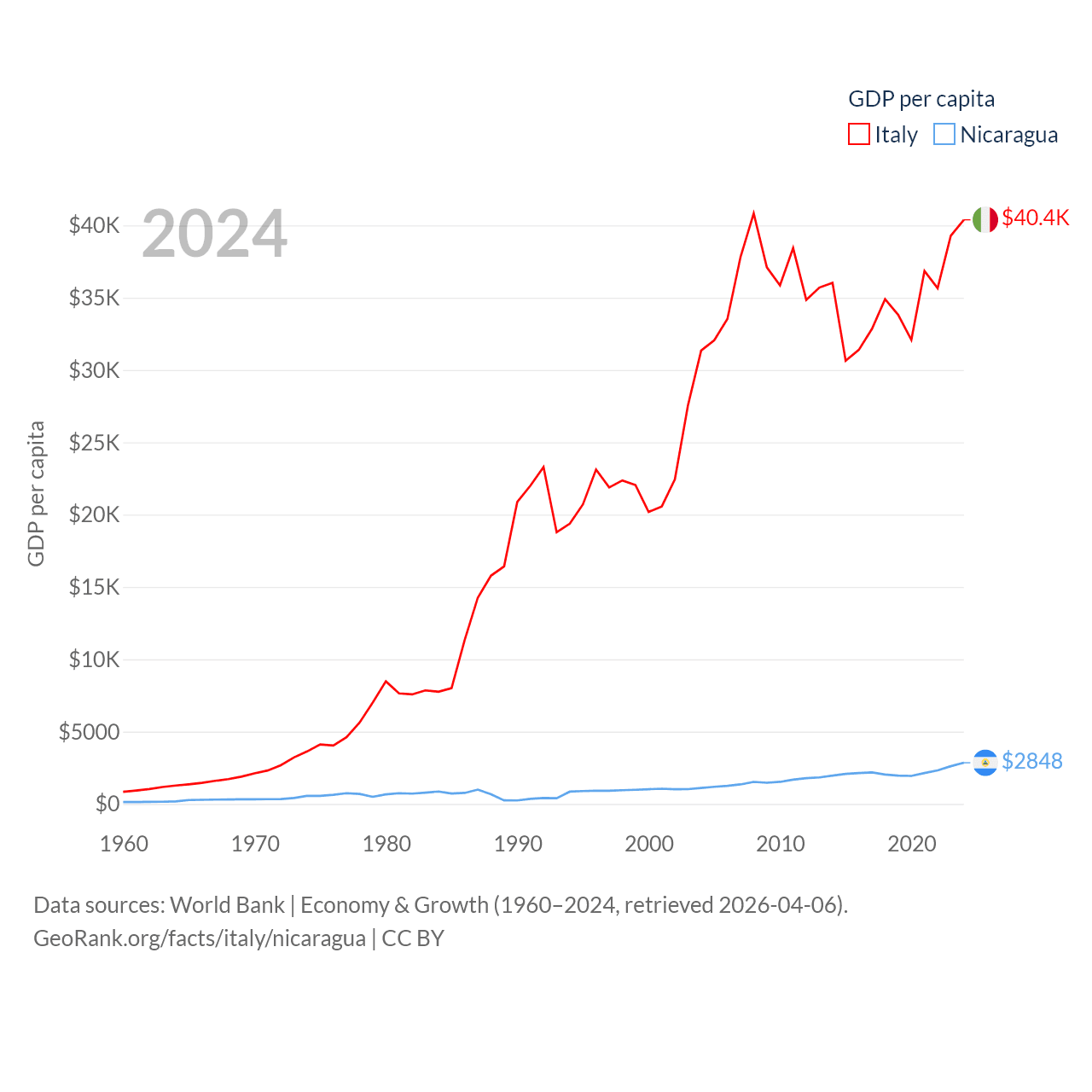 By GDP, Italy ranks 8/197 ($2.38T) and Nicaragua ranks 131/197 ($19.7B). By GDP per capita, Italy ranks 29/197 ($40,385), while Nicaragua ranks 141/197 ($2,848).