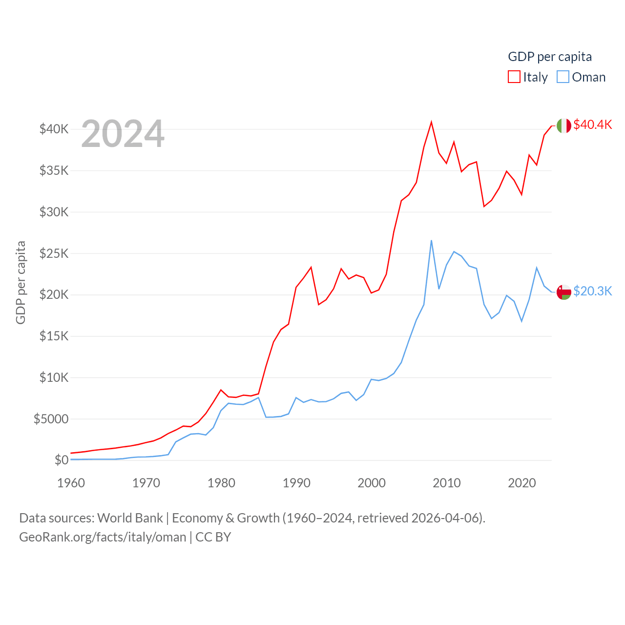 By GDP, Italy ranks 8/197 ($2.38T) and Oman ranks 70/197 ($107B). By GDP per capita, Italy ranks 29/197 ($40,385), while Oman ranks 57/197 ($20,285).