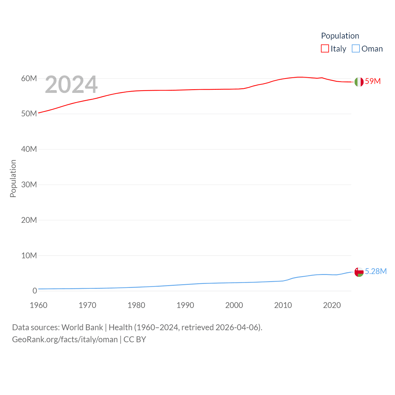 Italy has a population of 59M (ranked 25/197), compared with 5.28M in Oman (ranked 124/197). Italy's land area is 114,178 sq mi versus 119,499 sq mi for Oman (ranked 72nd vs. 68th).