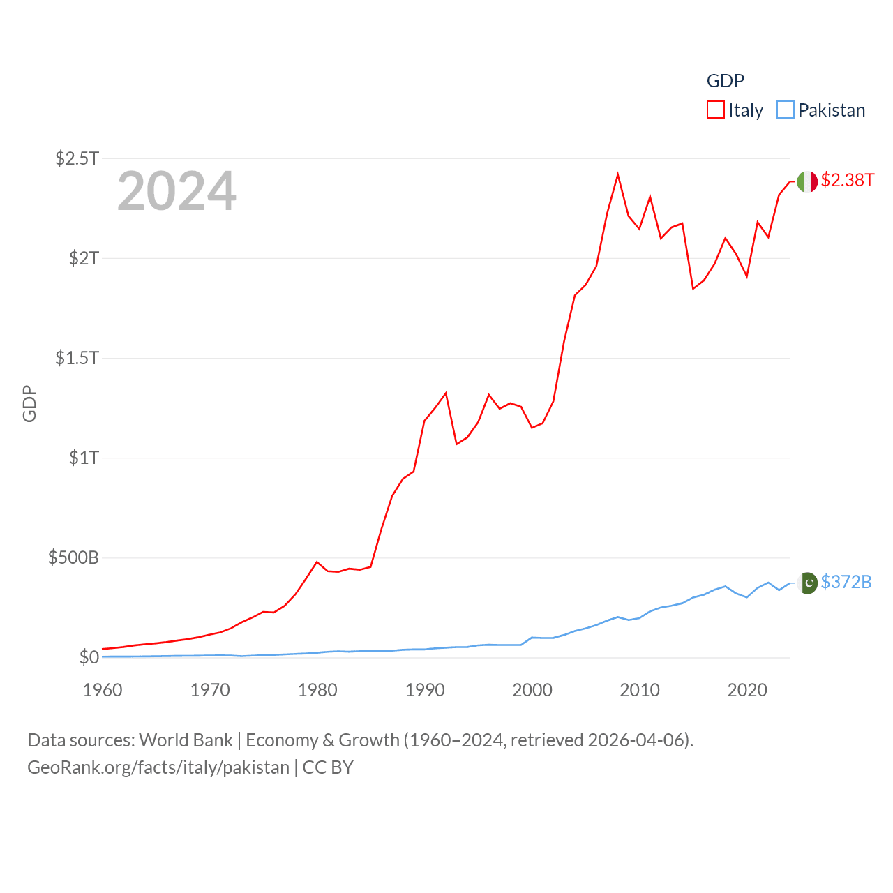 By GDP, Italy ranks 8/197 ($2.38T) and Pakistan ranks 43/197 ($372B). By GDP per capita, Italy ranks 29/197 ($40,385), while Pakistan ranks 163/197 ($1,479).