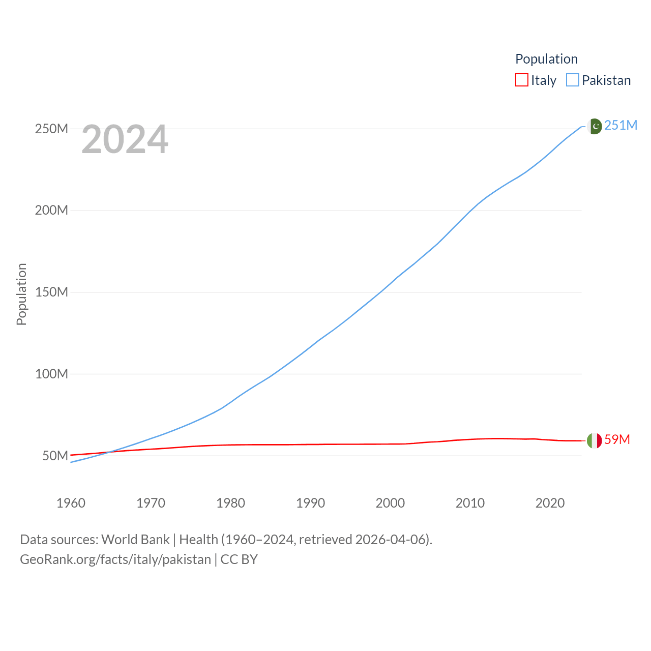 Italy has a population of 59M (ranked 25/197), compared with 251M in Pakistan (ranked 5/197). Italy's land area is 114,178 sq mi versus 297,638 sq mi for Pakistan (ranked 72nd vs. 35th).
