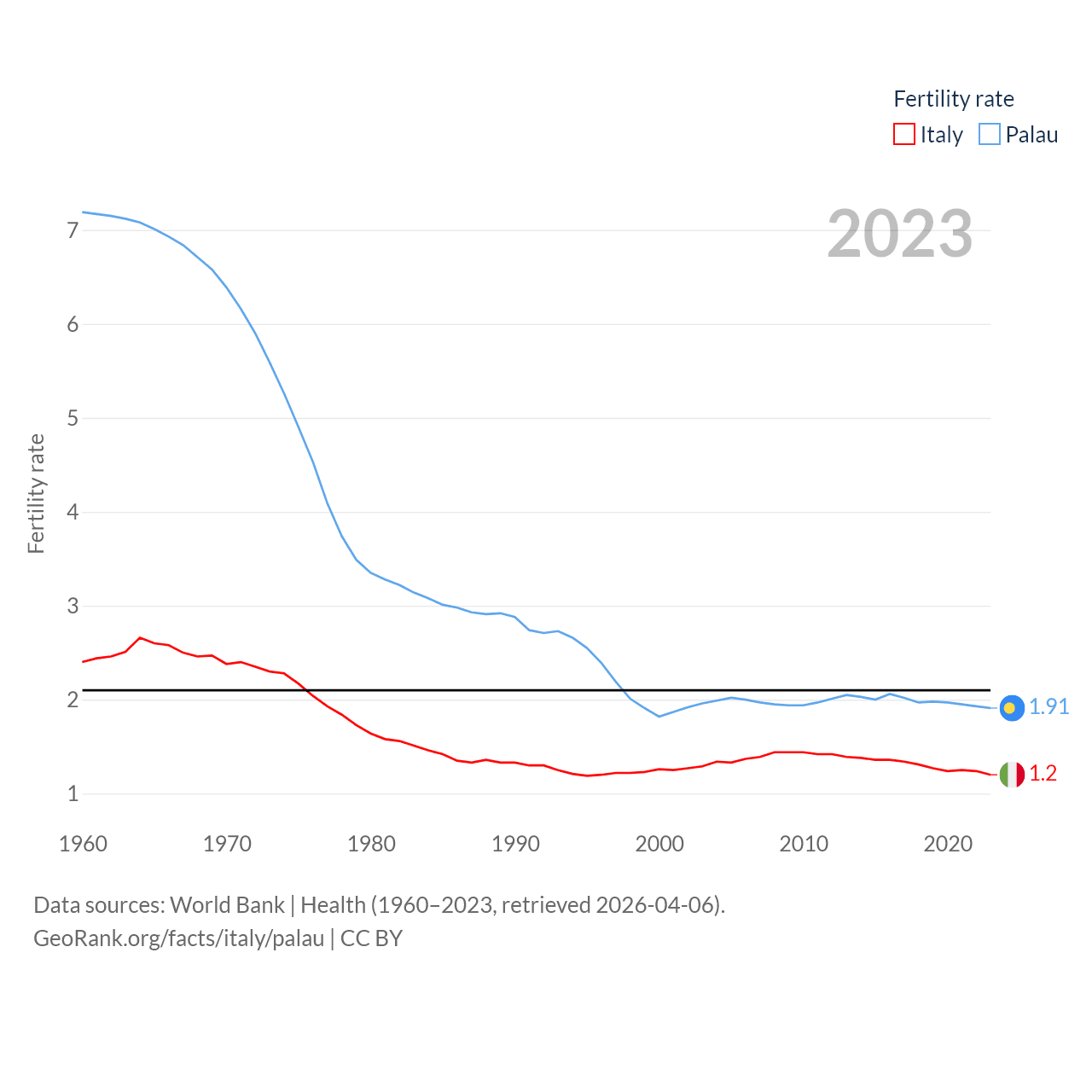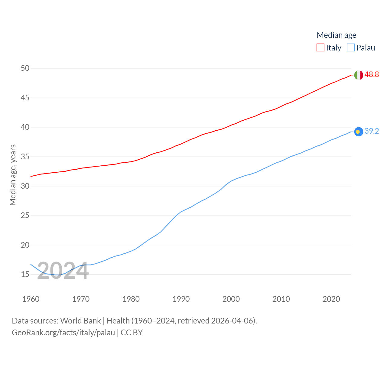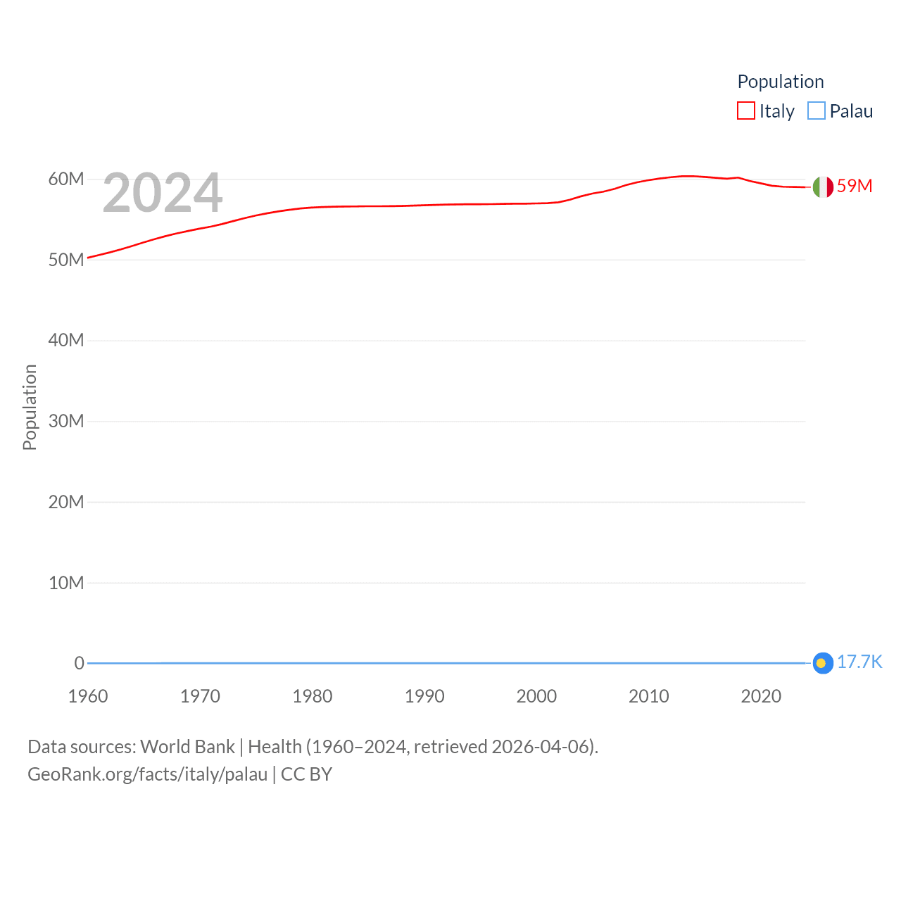 Italy has a population of 59M (ranked 25/197), compared with 17.7K in Palau (ranked 194/197). Italy's land area is 114,178 sq mi versus 177.6 sq mi for Palau (ranked 72nd vs. 180th).