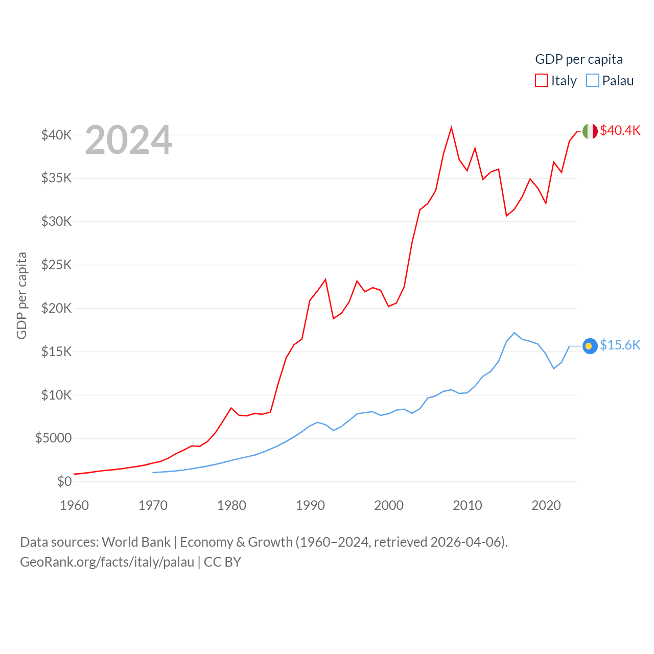 By GDP, Italy ranks 8/197 ($2.38T) and Palau ranks 194/197 ($277M). By GDP per capita, Italy ranks 29/197 ($40,385), while Palau ranks 67/197 ($15,611).