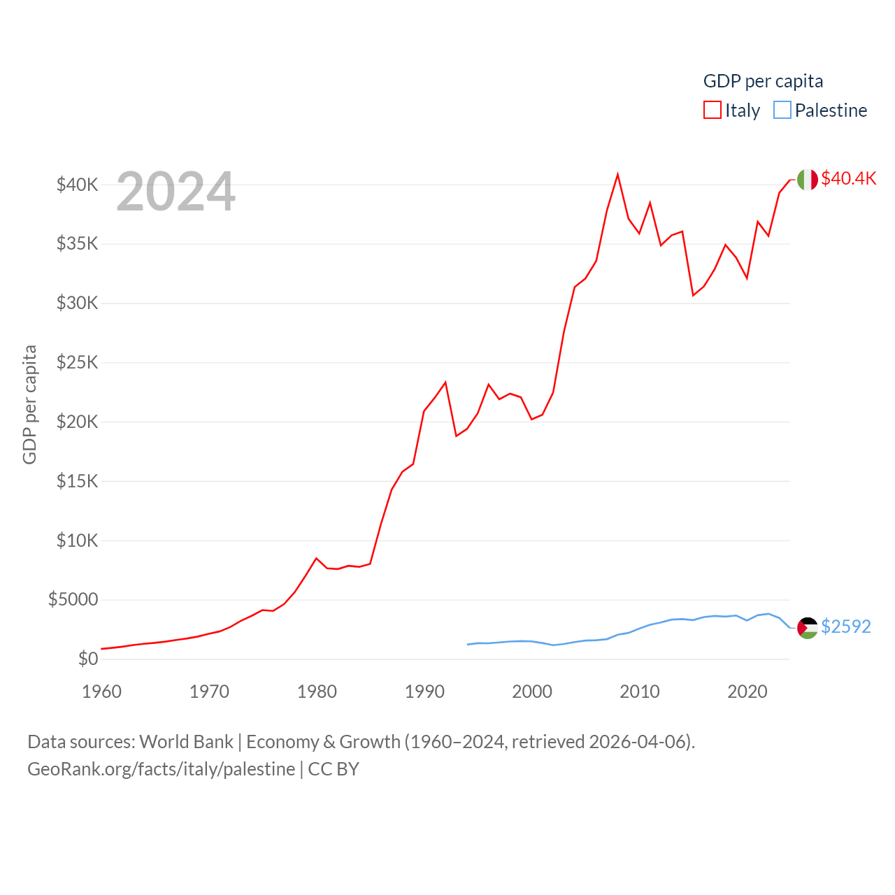 By GDP, Italy ranks 8/197 ($2.38T) and Palestine ranks 146/197 ($13.7B). By GDP per capita, Italy ranks 29/197 ($40,385), while Palestine ranks 147/197 ($2,592).