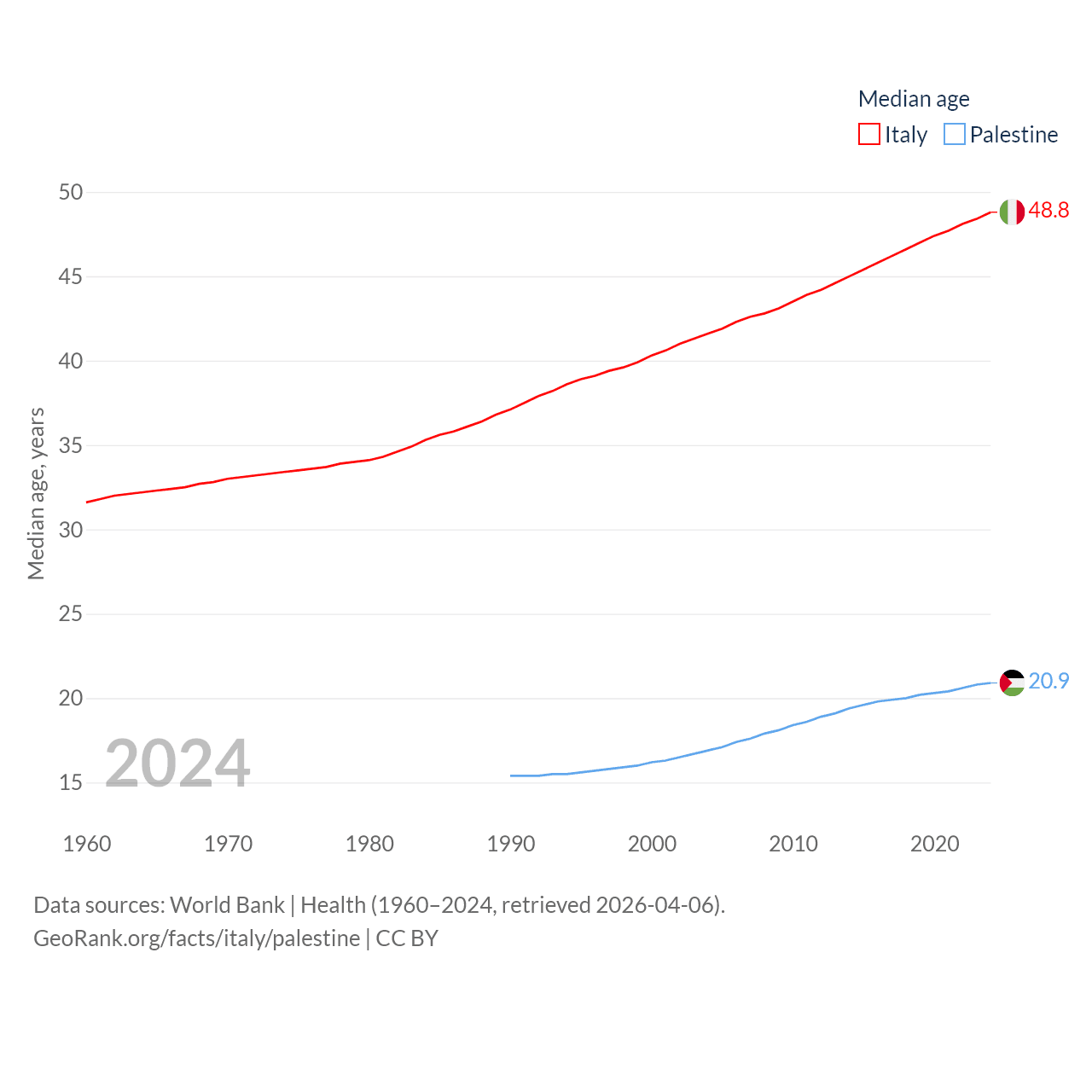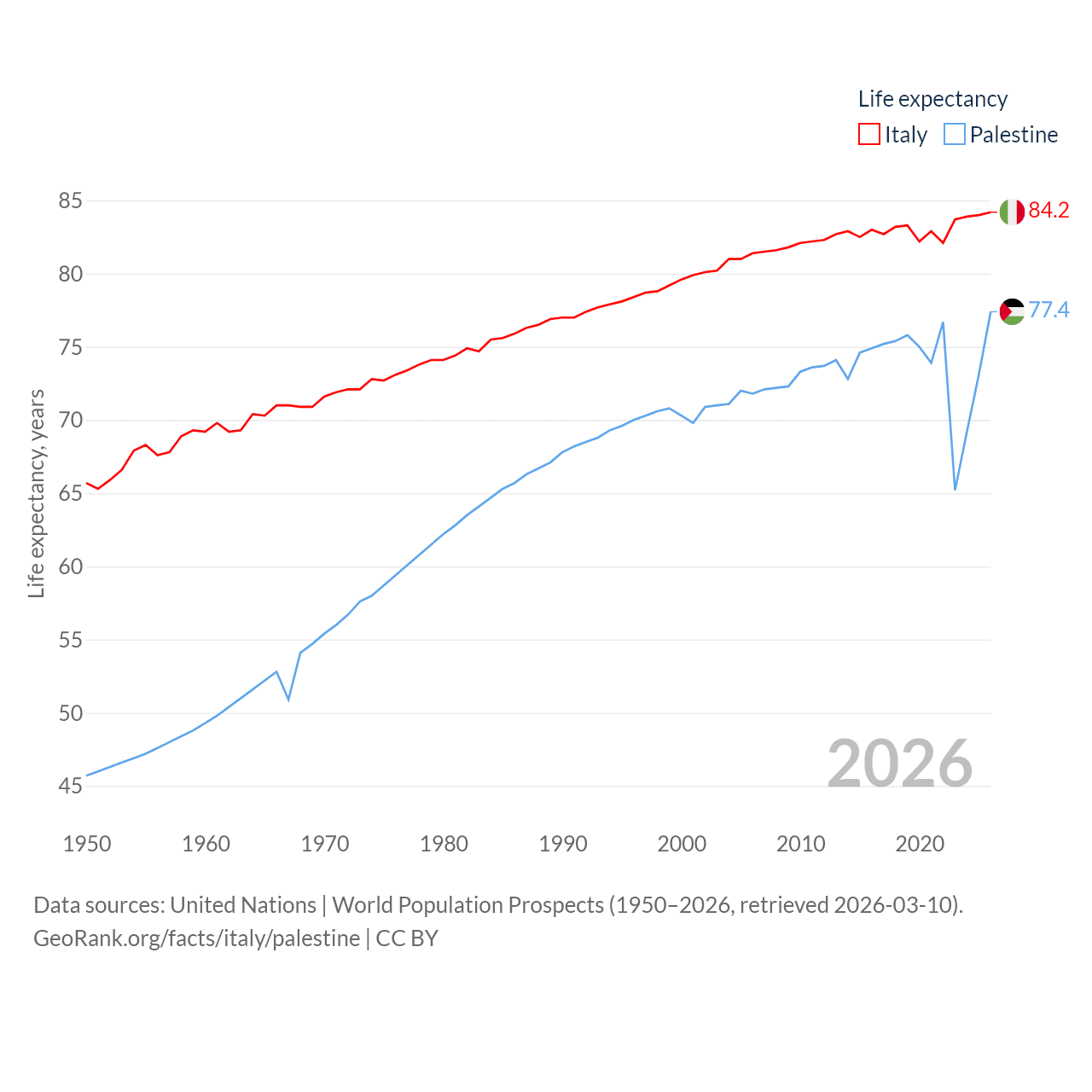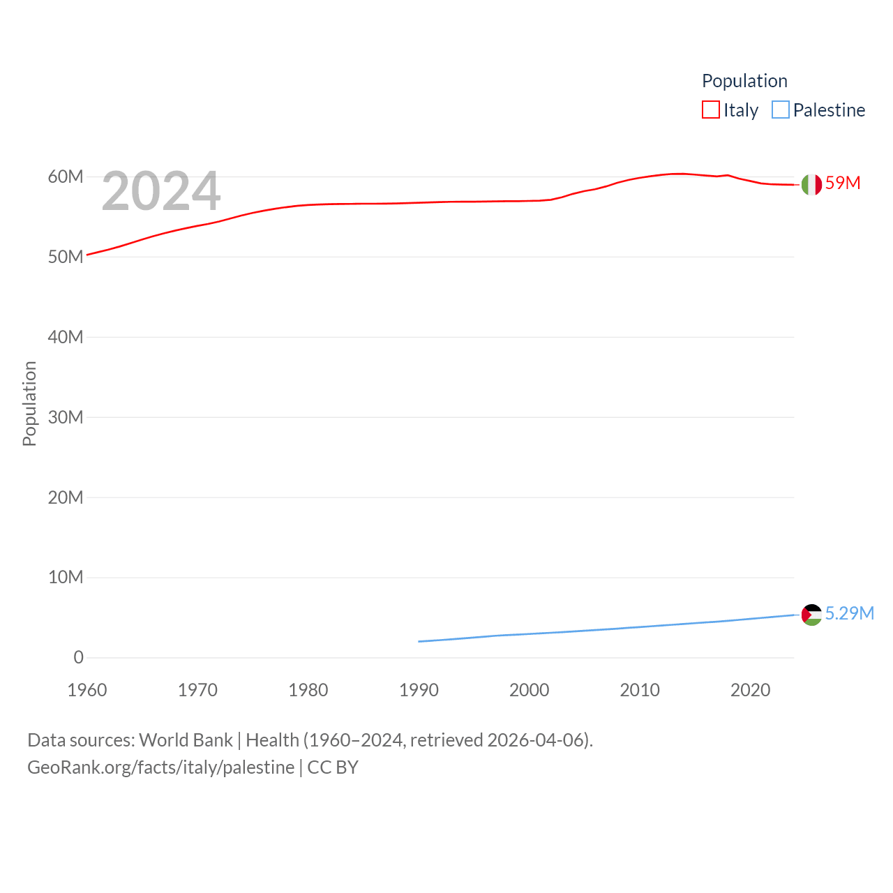 Italy has a population of 59M (ranked 25/197), compared with 5.29M in Palestine (ranked 122/197). Italy's land area is 114,178 sq mi versus 2,326 sq mi for Palestine (ranked 72nd vs. 164th).