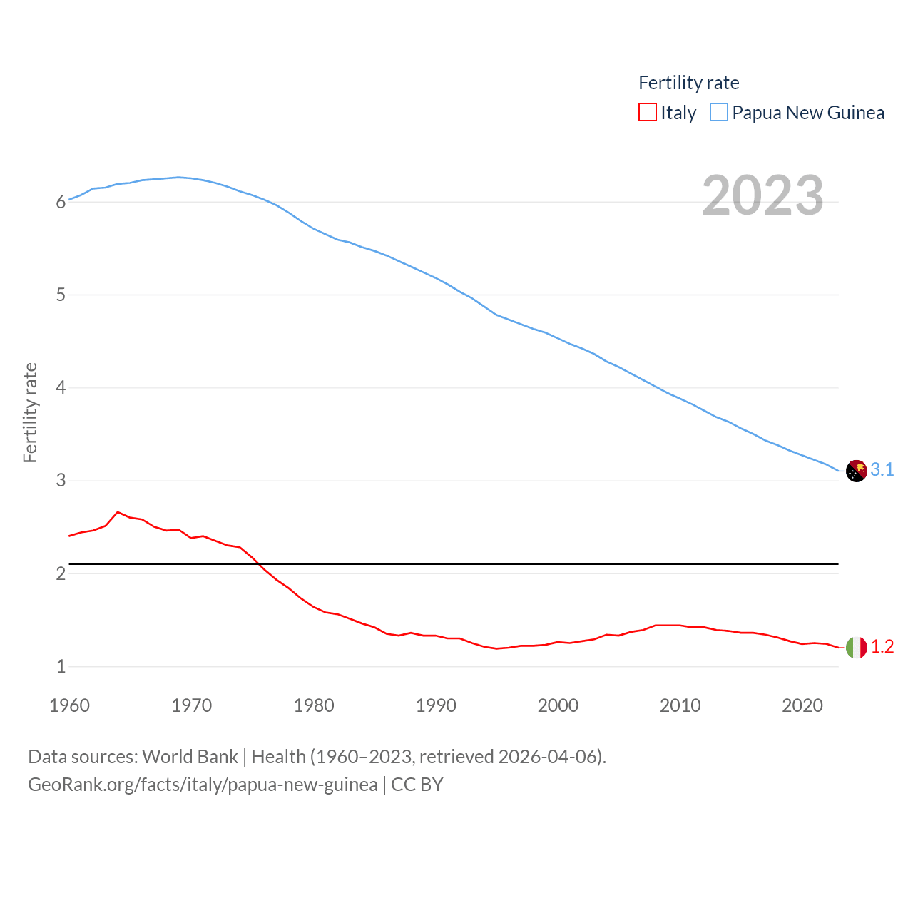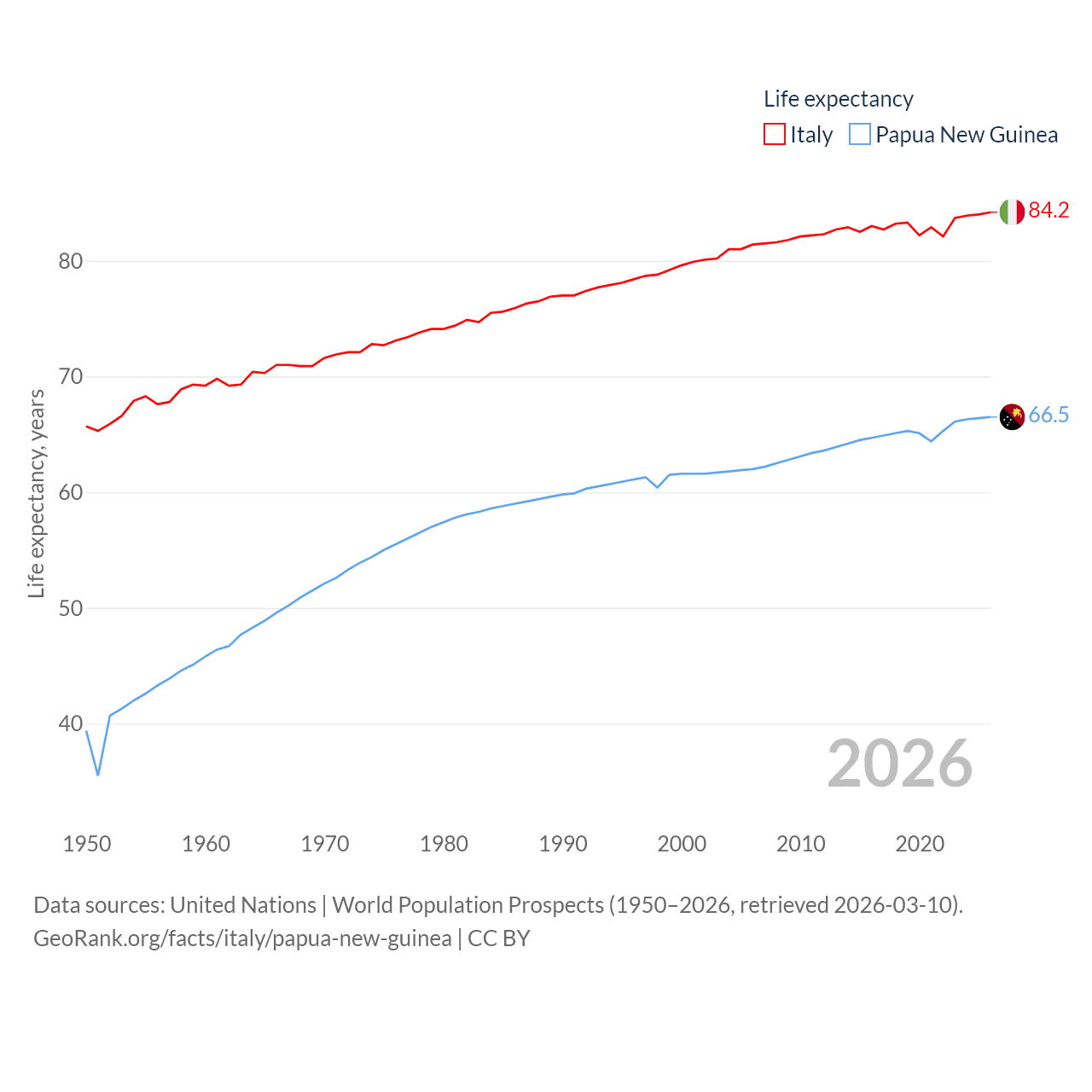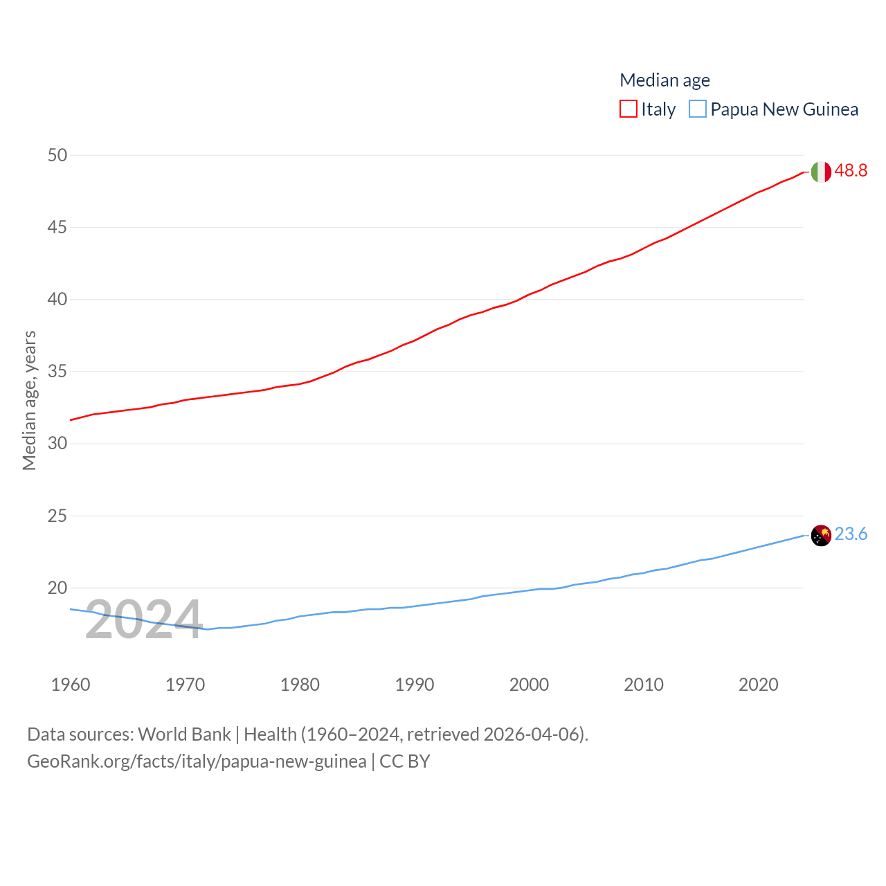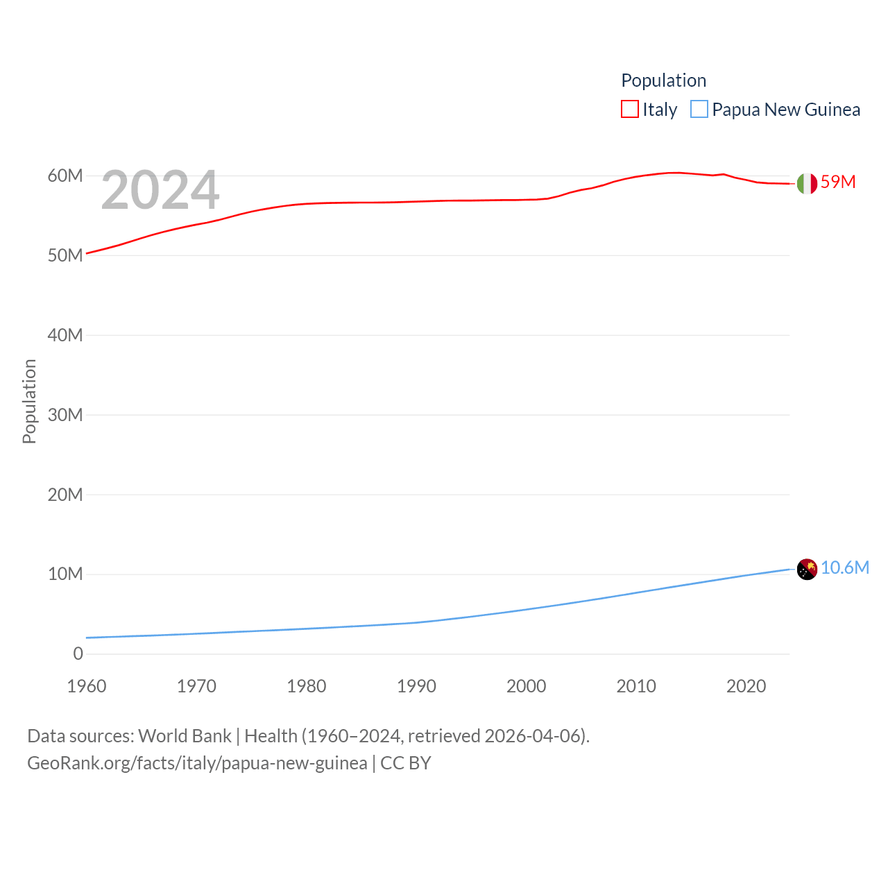 Italy has a population of 59M (ranked 25/197), compared with 10.6M in Papua New Guinea (ranked 92/197). Italy's land area is 114,178 sq mi versus 174,850 sq mi for Papua New Guinea (ranked 72nd vs. 54th).