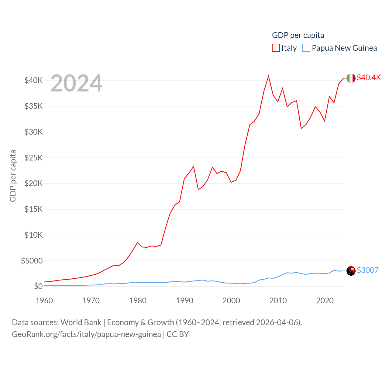 By GDP, Italy ranks 8/197 ($2.38T) and Papua New Guinea ranks 110/197 ($31.8B). By GDP per capita, Italy ranks 29/197 ($40,385), while Papua New Guinea ranks 140/197 ($3,007).