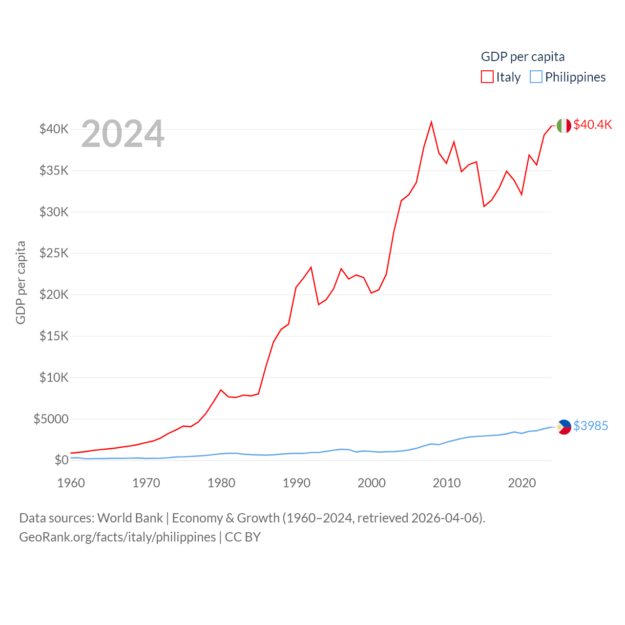 By GDP, Italy ranks 8/197 ($2.38T) and The Philippines ranks 35/197 ($462B). By GDP per capita, Italy ranks 29/197 ($40,385), while The Philippines ranks 130/197 ($3,985).